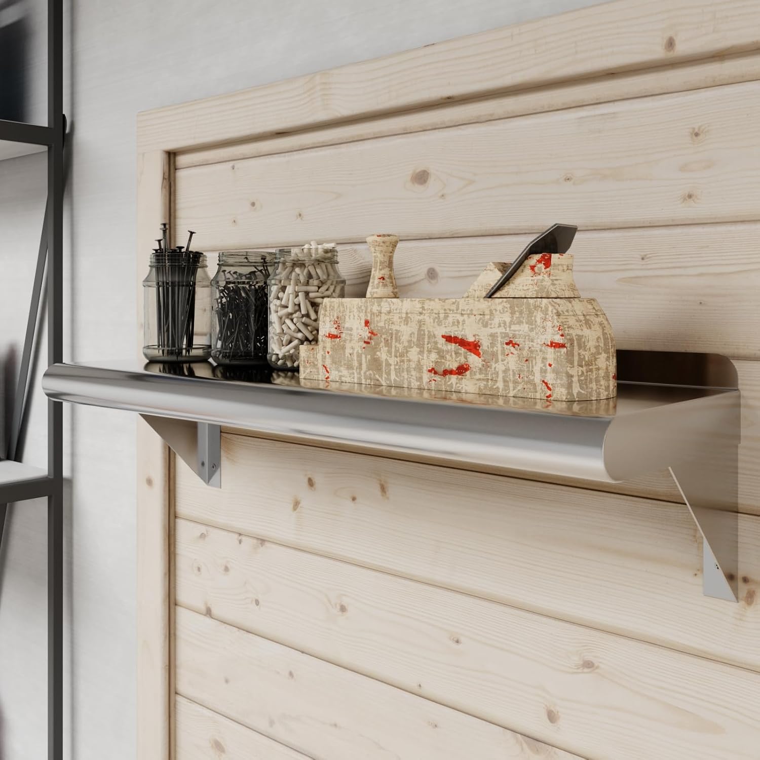 - This corrosion-resistant wall mount shelf can handle anything you throw at it and will last for years to come. Easy to clean and sterilize, metal shelves are superior to wood or glass. Food and liquid won’t get stuck or ruin the integrity of the surface. Easily wipe away excess with no fuss, mess, or contamination.