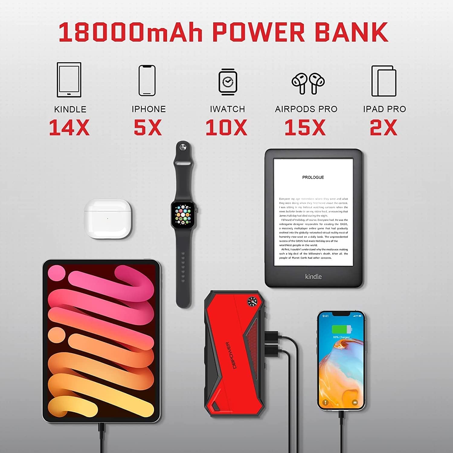 DBPOWER Peak 1600A 18000mAh Portable Car Jump Starter(up to 7.2 Gas, 5.5L Diesel Engines) Battery Booster with Smart Charging Port, LCD Display, Intelligent Jumper Clamps, Compass and LED Light