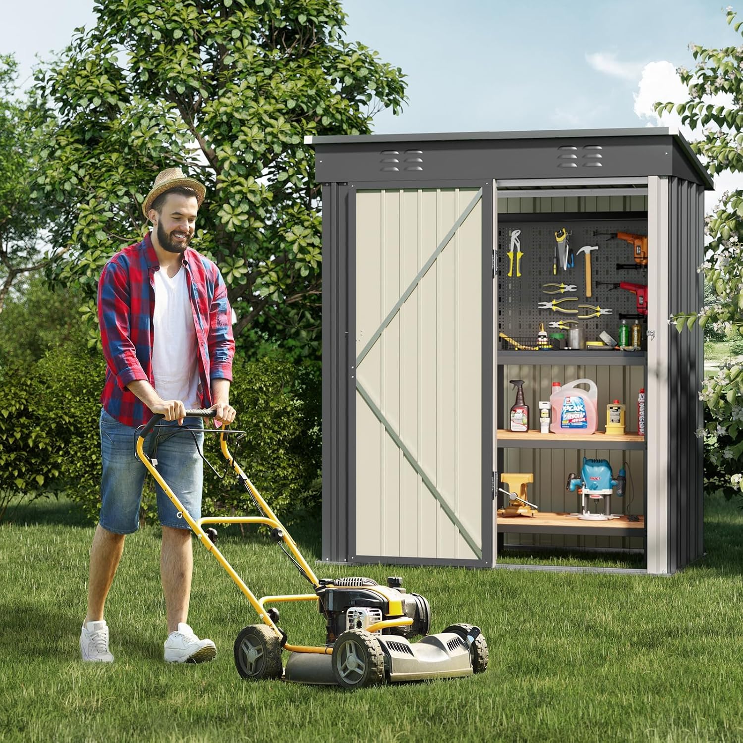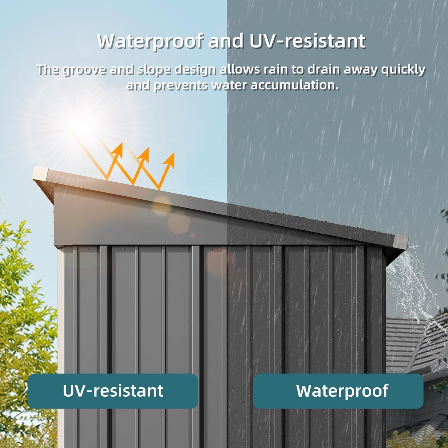 - 【Durable & Sturdy Design】Our outdoor storage cabinet is built to withstand the elements. The sloped, grooved roof prevents water from pooling, keeping your tools dry even in heavy rain. Thoughtful safety features like anti-collision and screw protection make this backyard storage shed ideal for family backyards.
