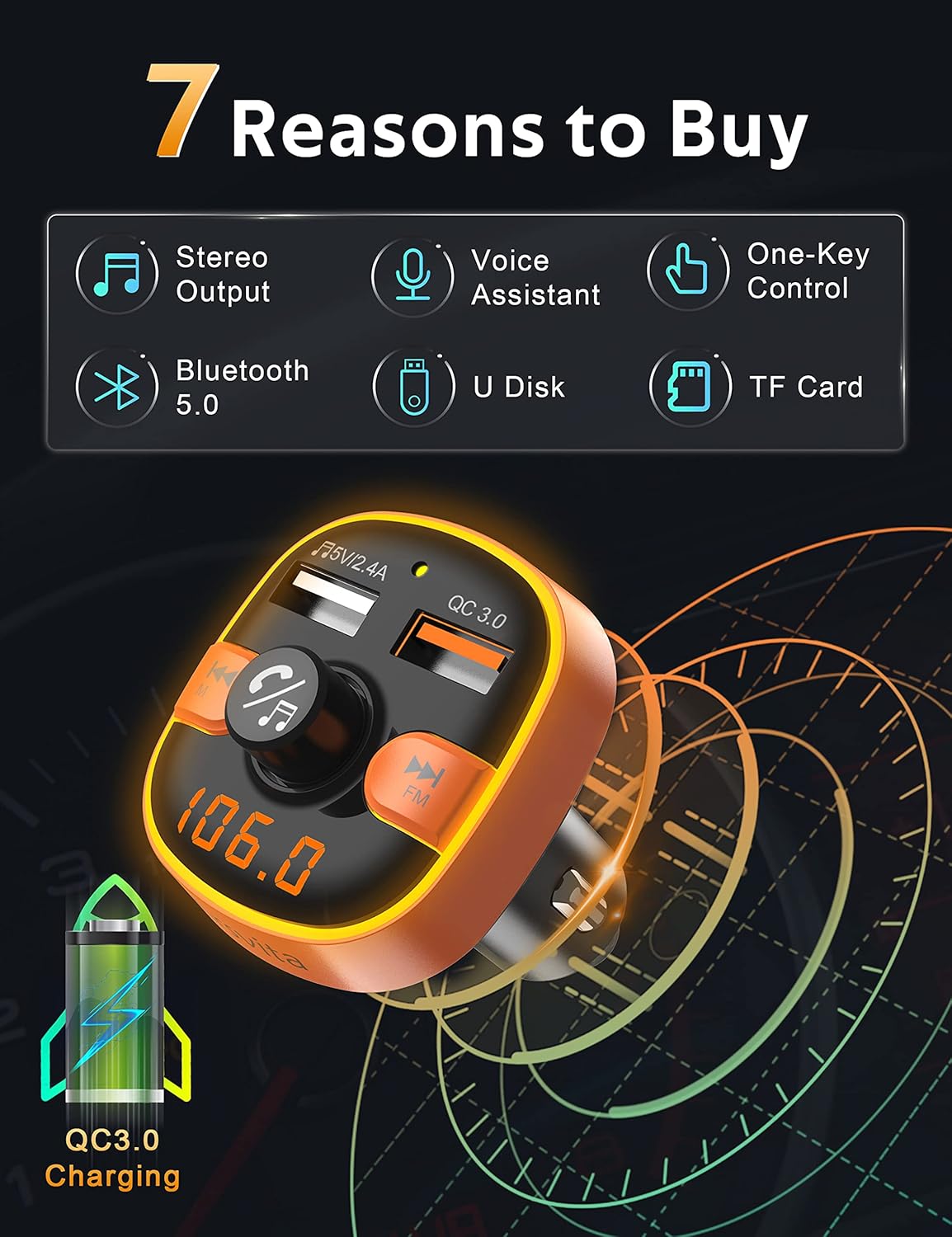 Upgraded Arsvita Bluetooth FM Transmitter for Car, Radio Receiver/Audio Adapter with Dual Car Charger, Support QC3.0 Quick Charging, Hands-Free Calling and Hi-Fi Sound Playback, Orange