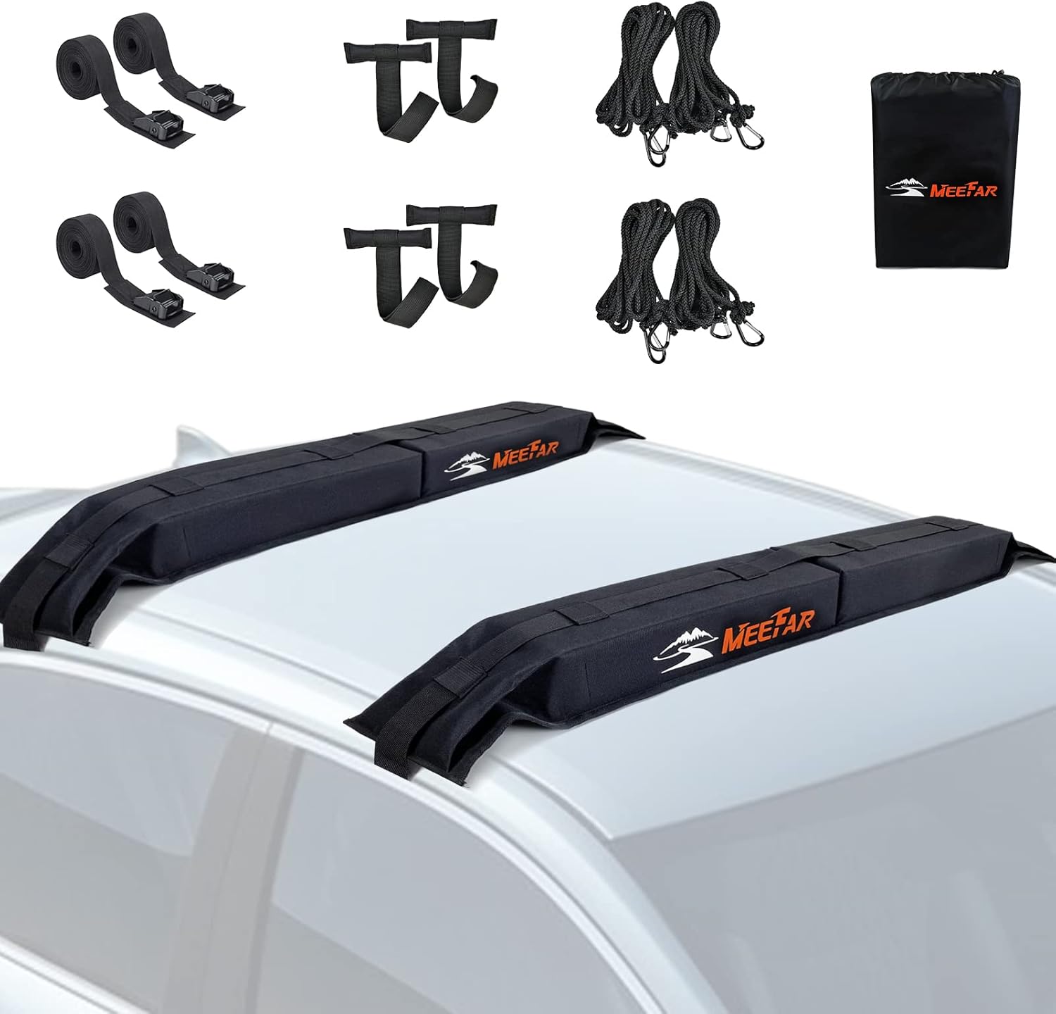 MeeFar Universal Car Soft Roof Rack Pads Luggage Carrier System for Kayak Surfboard SUP Canoe Include 2 Heavy Duty Tie Down Straps, 4 Tie Down Rope, 4 Quick Loop Strap and Storage Bag