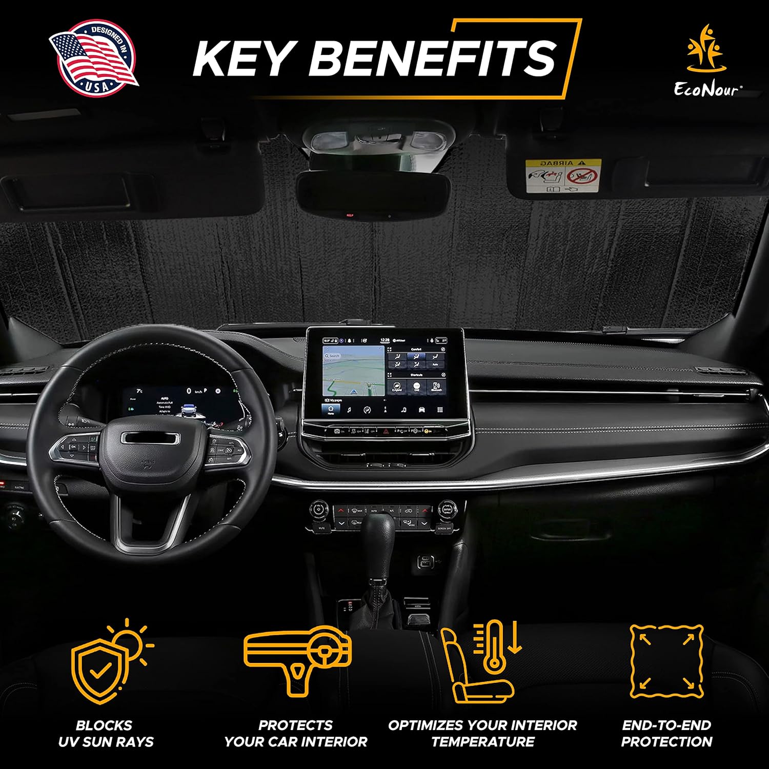 - Comprehensive UV & Heat Protection: EcoNour’s accordion sunshade for car windshield offers unbeatable protection by blocking up to 98% of harmful UV rays, safeguarding your vehicle’s interior from sun damage. This windshield sun shade accordion reduces interior temperatures by up to 90°F, ensuring a cool cabin even on the hottest days.