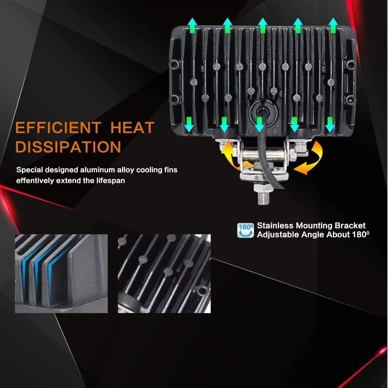 - BETTER HEAT DISSIPATION: The led work lights are solidly constructed with die-cast aluminum shells that have deep built in cooling fins to help dissipate heat that extend the lifespan to over 50,000 hours.