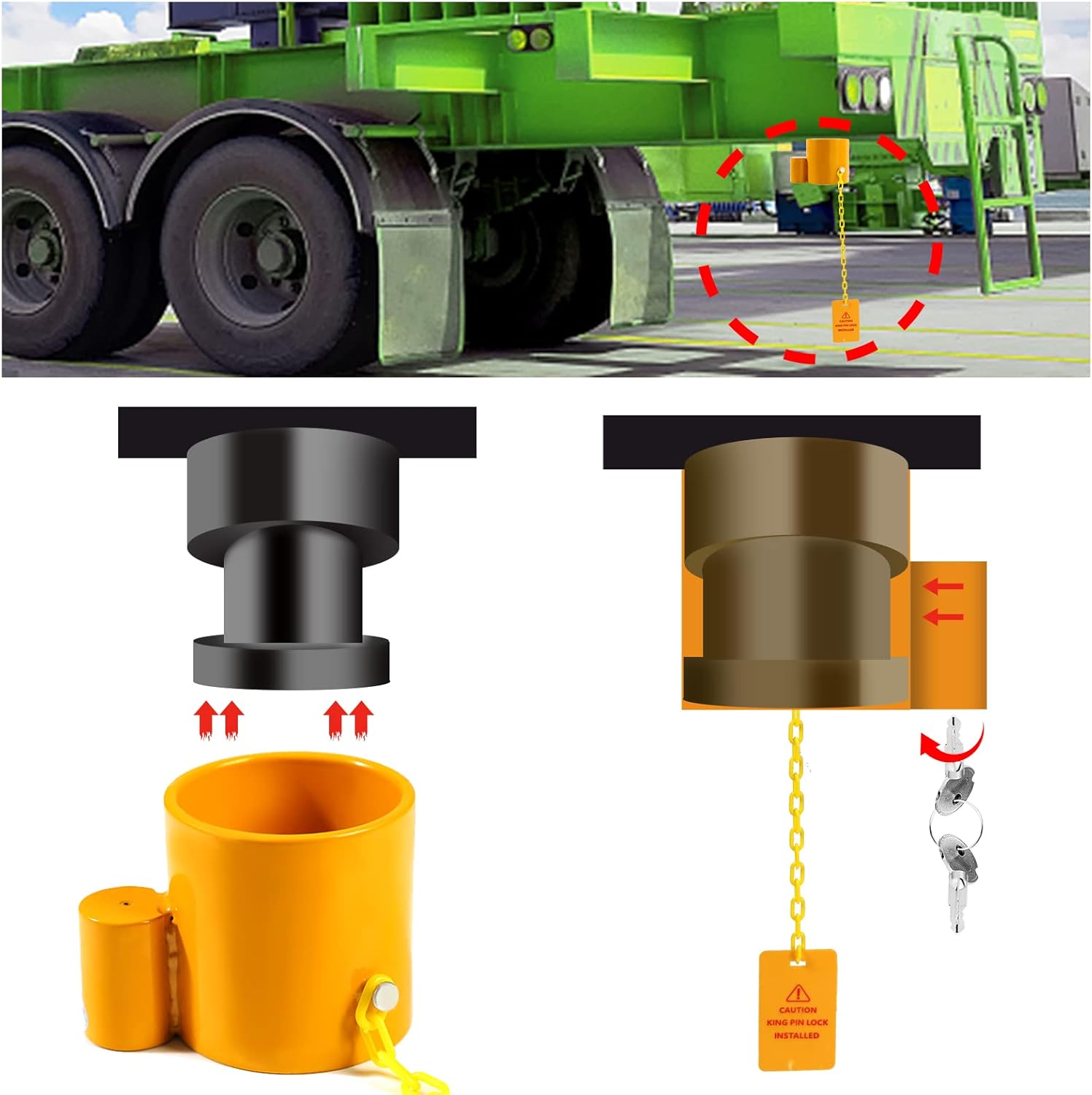- This king pin lock is designed to be bright yellow, has strong visible warning, so you could notice if it is still stay in place, each lock includes a fluorescent warning tag on 12" chain, warning information on each label for extra safety.