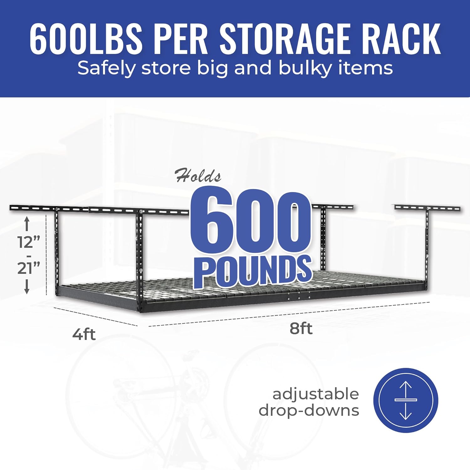 - INDUSTRIAL STORAGE RACK: Our industrial rack is a great fit for virtually any garage. It features a full 600 pound weight capacity and adjustable height ranging from 12 to 21 inches from the ceiling. Store storage bins with ease with our hanging storage rack.