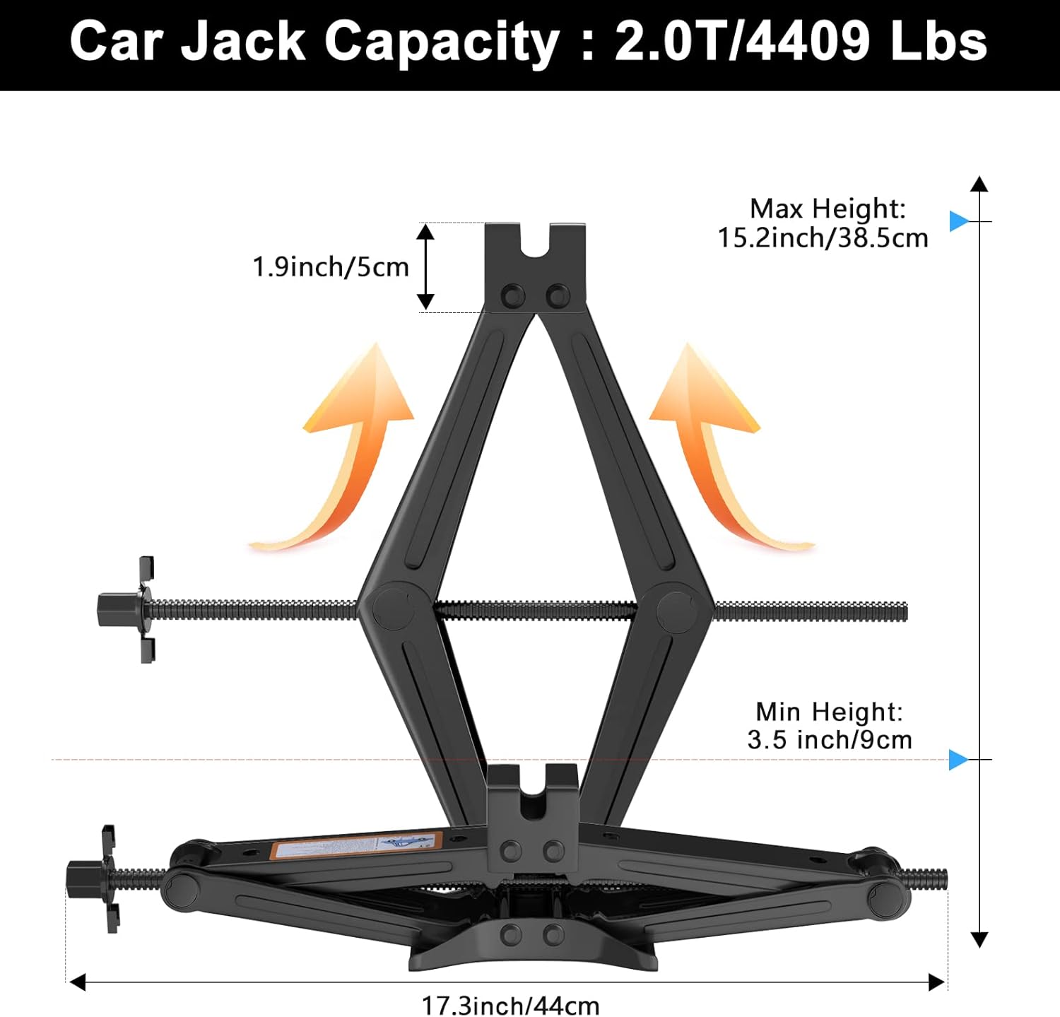 - ă Load Capacity ăMax Load weight: 2.0 Ton (4,409 lbs),Car Lifting Range from 3.5" (89mm) to 15.2"(385mm). Car Jack Net weight 4.84 lbs (2.2kg).