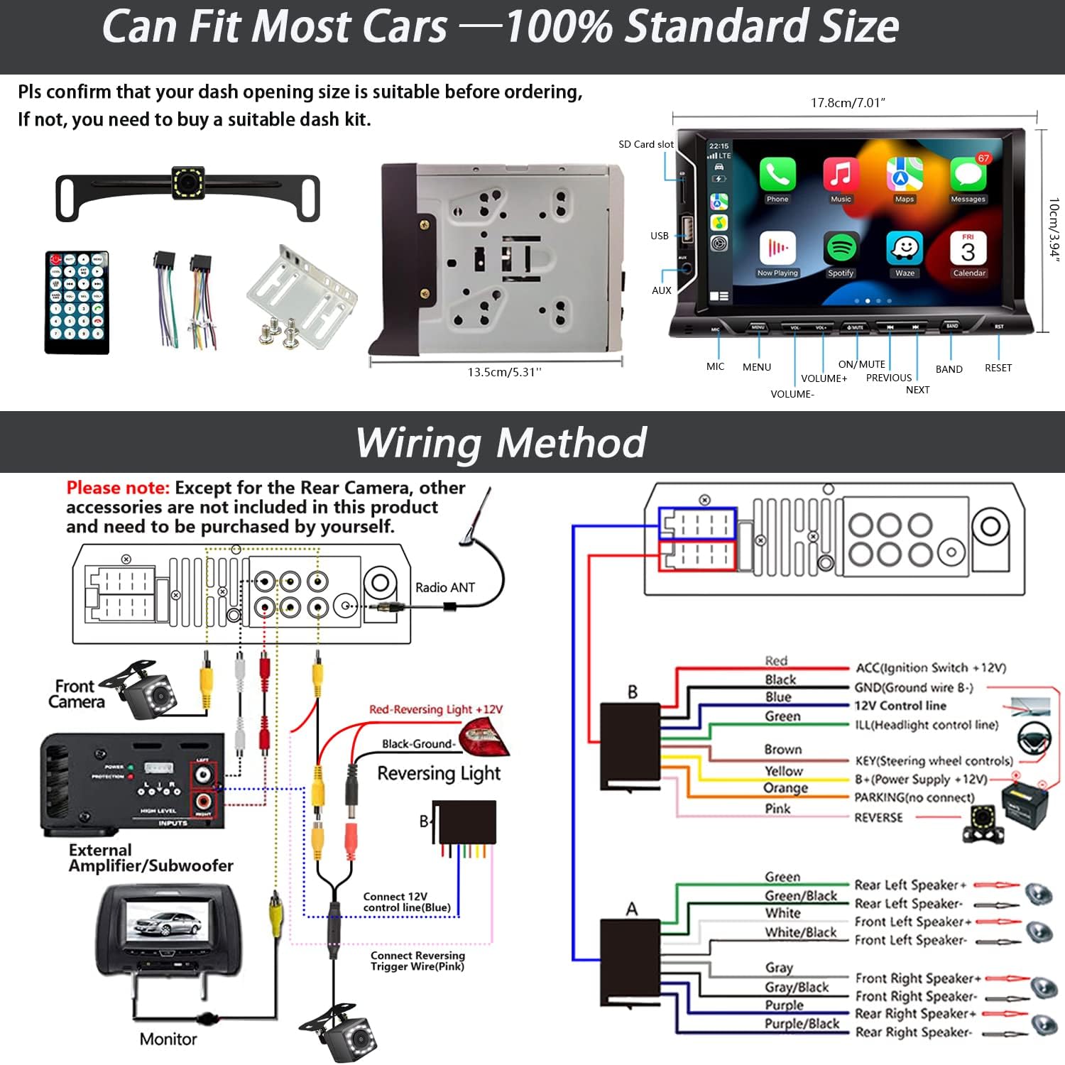 - [7 INCH CAR RADIO TOUCHSCREEN] Supports FM Radio, USB, TF Card (up to 32 GB), AUX IN, mirror link, music player, video player, steering wheel control. High resolution screen quality, full capacitive touch screen for more sensitive and accurate operation. Physical buttons make it easier to use while driving. The size of this double din car stereo is 7.01"(L) * 5.31"(W) * 3.94"(H). It comes with a harness with naked wires. Some cars need to buy a dash kit and harness if you want perfectly fitted.