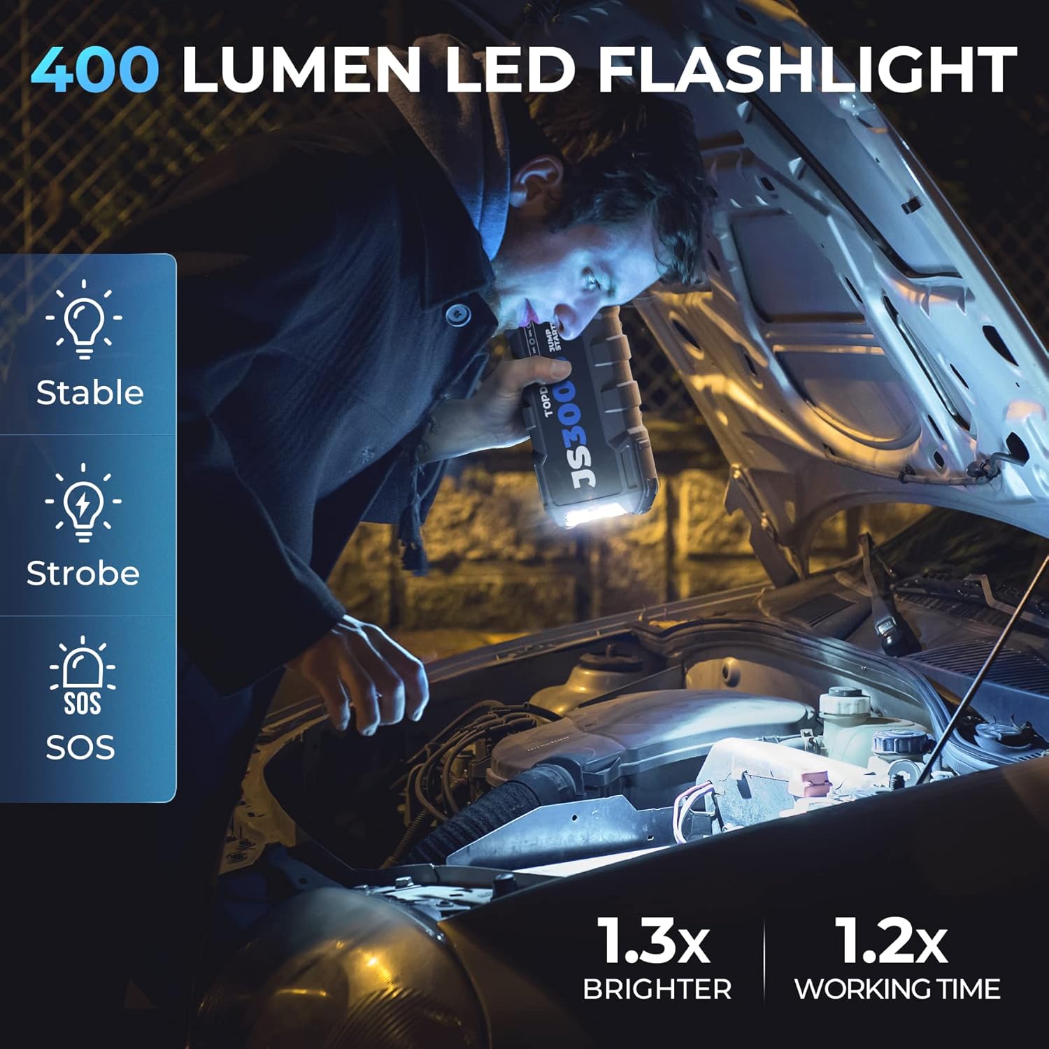 - ăMORE THAN A JUMP STARTERăThe JS3000 also serves as a portable 24000mAh power bank with 2 USB QC 3.0 ports, a 16.8V DC port, and a Type-C PD45W bi-directional charging port (charging your laptop from 0% to 100% in 2 hours or other devices in 1 hour). It has a super bright flashlight, providing you with 400 lumens of light, a SOS signal light in an emergency or outdoor adventure. When fully charged, the flashlight can be powered on for up to 30 hours.