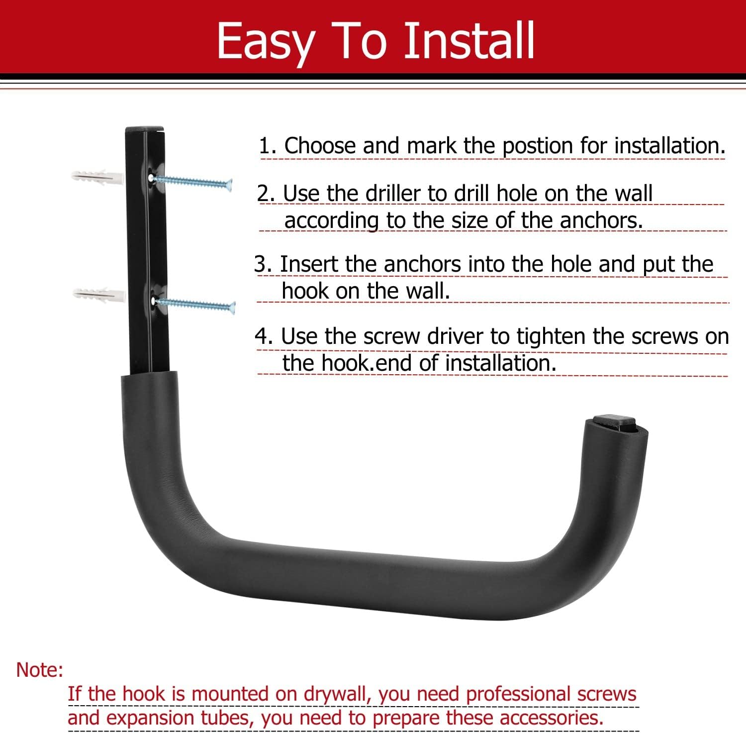 - EASY INSTALLATION: 4 pack 12.4Inch utility hook with 8pcs mounting screws and 8pcs plastic anchors, these hooks can be firmly mounted to drywall, wall stud and other type walls, easily and quickly. Our anchors, only suitable for hardwood and common walls.