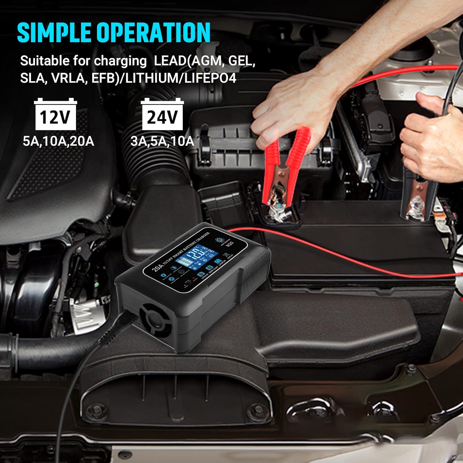 - 【Smart Automatic Charger】 12V 20 Amp Max, 24V 10Amp 7- stage battery charger suitable for all types of Calcium, GEL and AGM, Wet, EFB. A mode can be selected to charge car truck batteries, motorcycle batteries, or AGM batteries , 2AH - 200 AH , input 110V~240V , LifePo4 Lithium battery