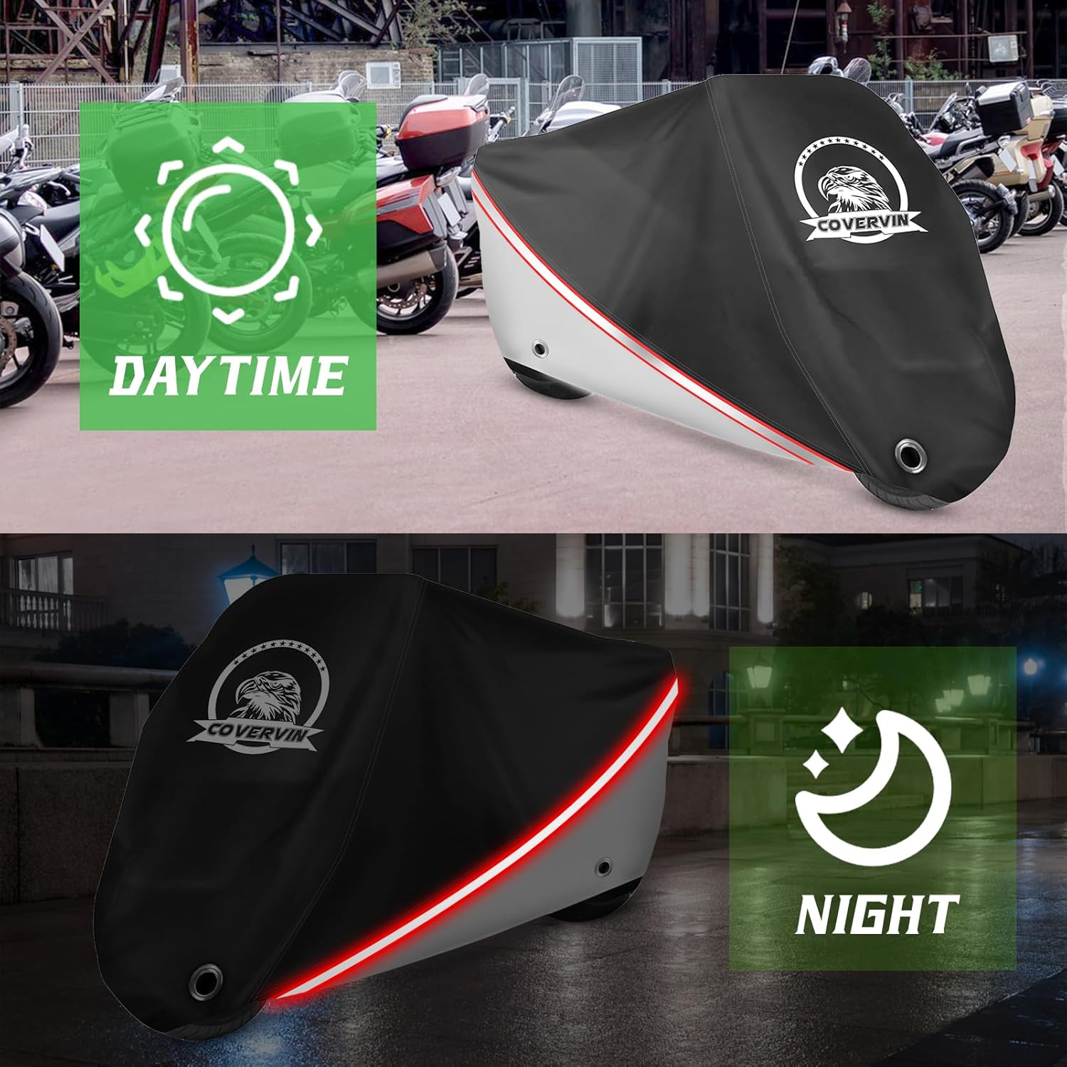 COVERVIN Motorcycle Cover, All Weather Outdoor Waterproof Night Protection with Reflective Strips, Locking Holes and Storage Bag for 104 Inch Suzuki, Kawasaki, Honda, Harley-Davidson(Silver XXL)
