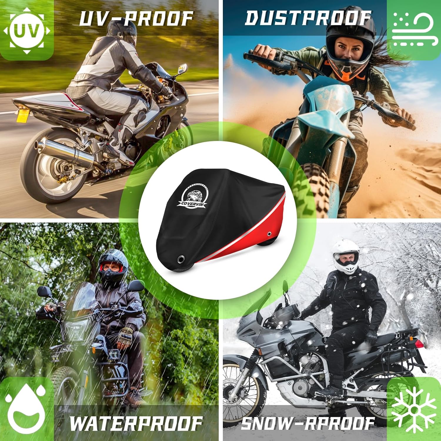 COVERVIN Motorcycle Cover, All Weather Outdoor Waterproof Night Protection with Reflective Strips, Locking Holes and Storage Bag for 104 Inch Suzuki, Kawasaki, Honda, Harley-Davidson(Red XXL)