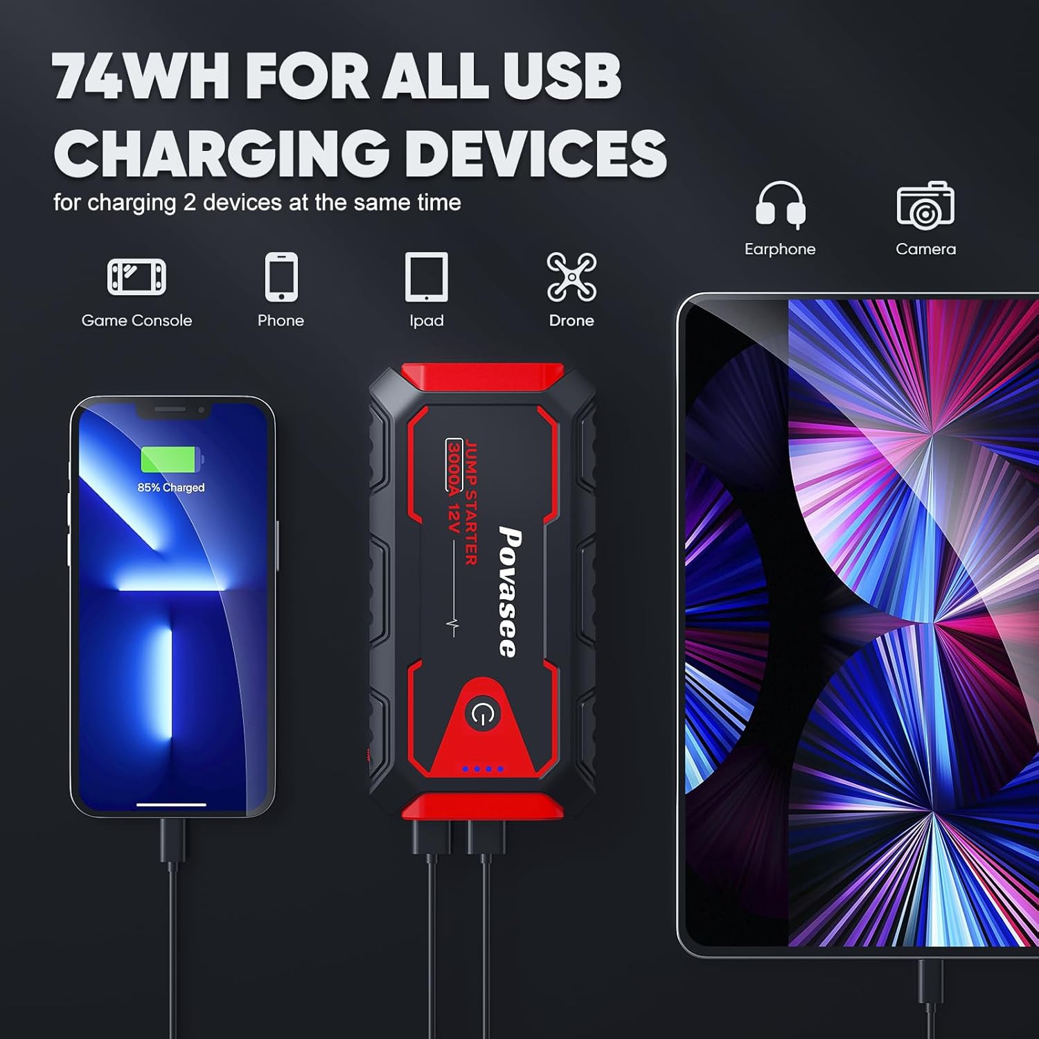 - ă3000A Car battery jump starteră: With Povasee 3000A jump starter can jump start 10L GAS/8.0L DIESEL engines within seconds. Even if the battery voltage is too low (below 9V), pressing the âRSTâ button will help the engine to restart.About 60 quick jump starts on a single charge. Suitable for 12V passenger cars, trucks, motorcycles, boats,tractor etc.