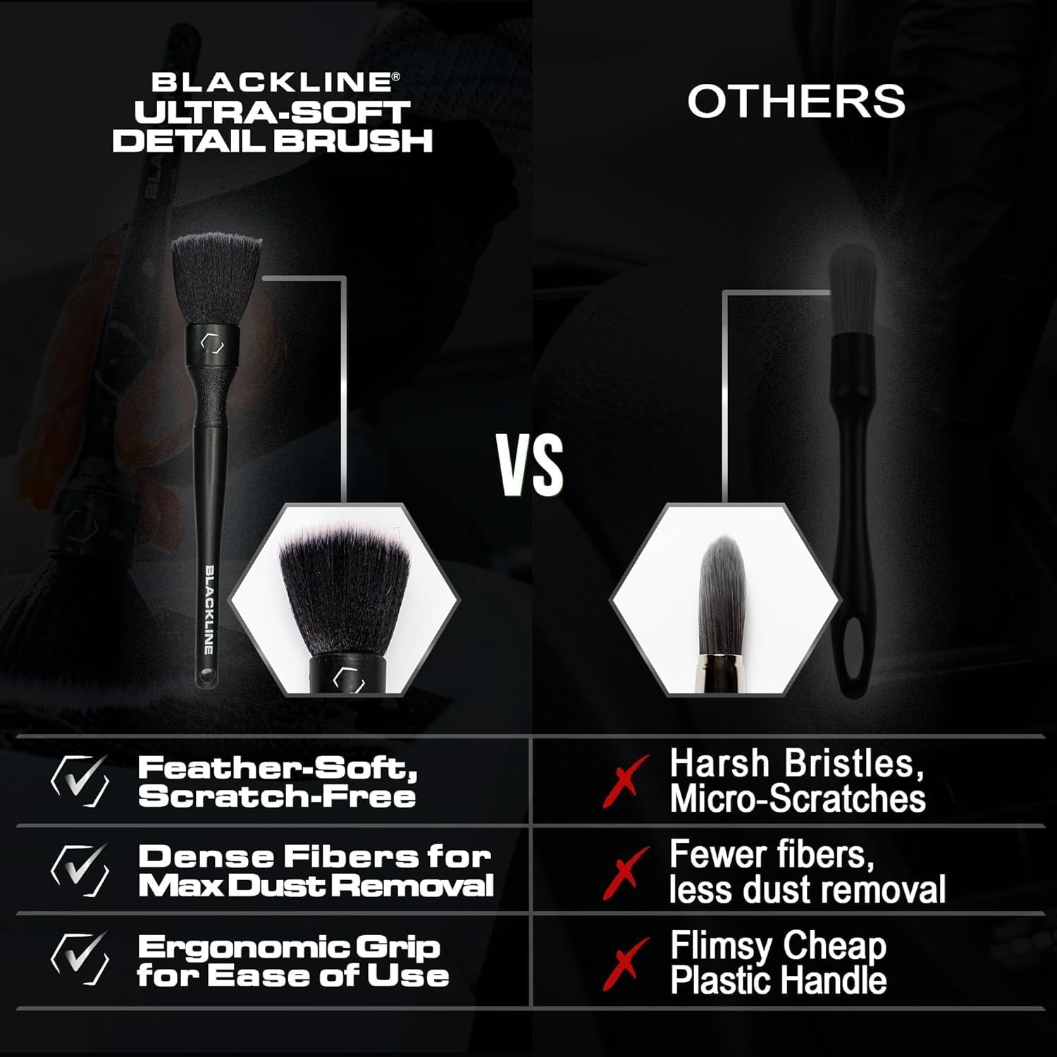 - Ultra-Soft Feathertip Bristles: The ultra soft Blackline detailing brush bristles allow for a scratch-free cleaning experience on interior and exterior surfaces, making this the best exterior and interior detailing brush!