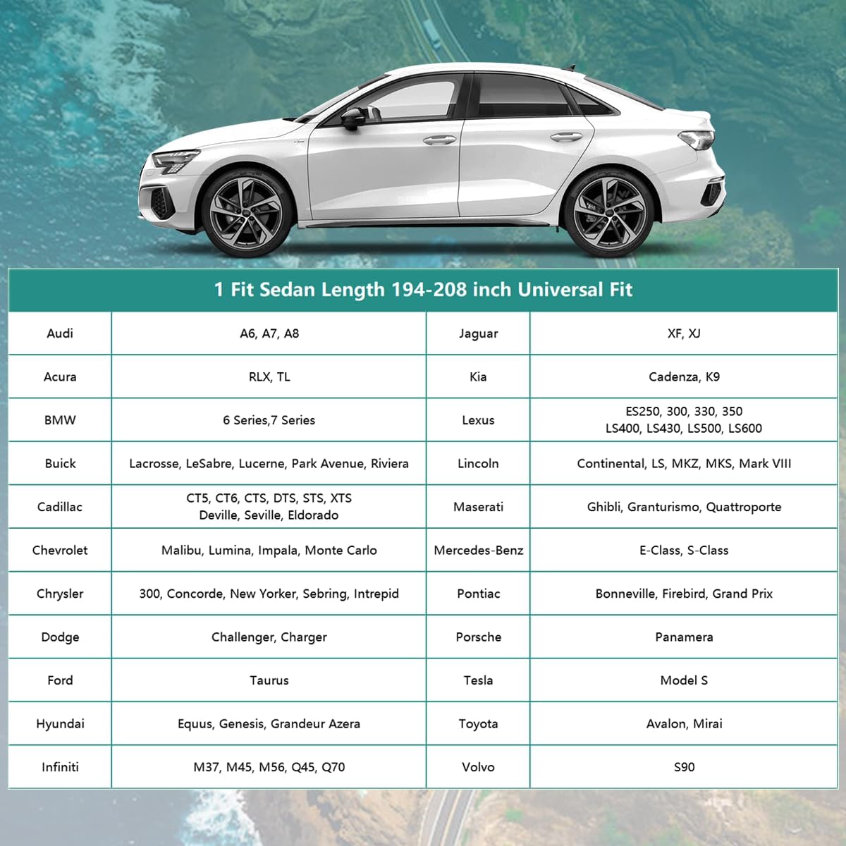 - ăModel ChoiceăGUNHYI automobiles cover is suitable for Sedan, Length 194 to 208 inch (Not for SUV Hatchback). For exmaple--Lexus ES350, Tesla Model S, Toyota Avalon, Hyundai Genesis, Jaguar XJ/XF, Lincoln MKZ, Dodge Charger, Chrysler 300, Ford Taurus, Buick Lacrosse/Lesabre, Cadillac Deville/Seville, Mercedes Benz S-Class etc.