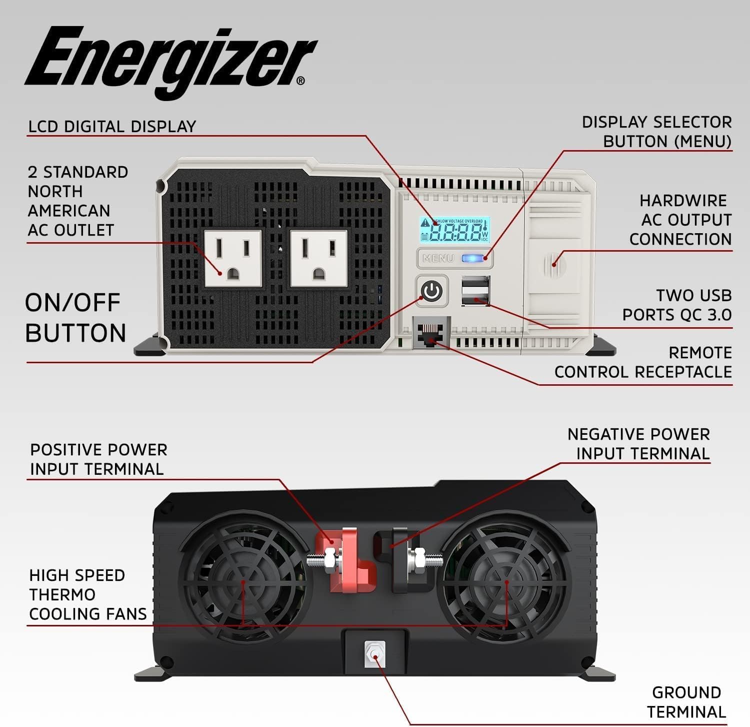 - ENERGIZER PURE SINE POWER INVERTER- 1100 watts continuous pure sine wave power, 2200 watts peak power, EP1100 pure sine wave power inverter converts 12V DC to 120V AC power, connect DC battery cables directly to your 12V battery and you have power on the go.