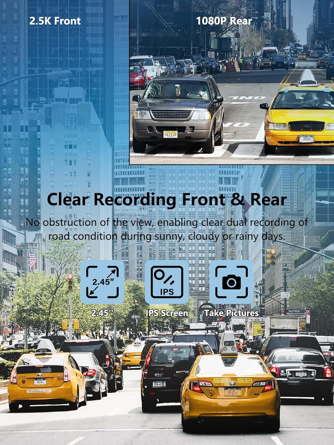 - 2.5K MINI DASH CAM FRONT AND REAR - âThe NEW VERSION has been updated since January 25, 2025. The resolution has been upgraded for a better experience. It comes with a 170 wide-angle 2.5K front camera and a 1080P HD waterproof rear camera that captures all three lanes of the road. This mini and compact dash cam won't obscure your view. Meanwhile, the IPS display and WDR function make video recording more vivid, colorful and clear.