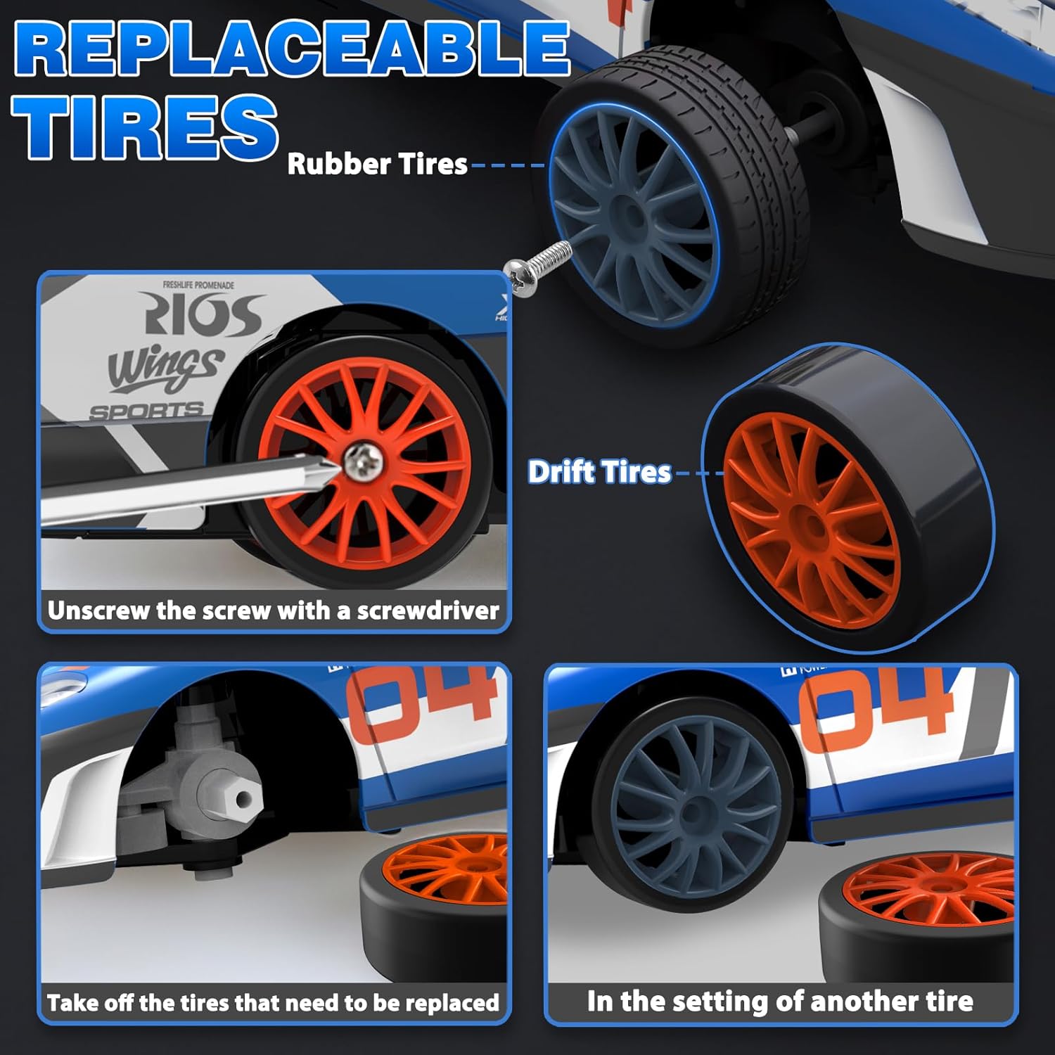 RC Drift Car 2.4GHz 1:24 Scale 4WD Remote Control Car 15KM/H High Speed Drifting RC Cars with Cool Lights, Two Batteries and Extra Tires Toys for Kids Boys Girls Adults, Blue