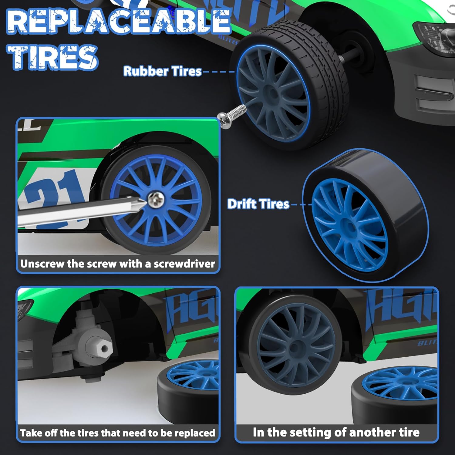 RC Drift Car 2.4GHz 1:24 Scale 4WD Remote Control Car 15KM/H High Speed Drifting RC Cars with Cool Lights, Two Batteries and Extra Tires Toys for Kids Boys Girls Adults, Green