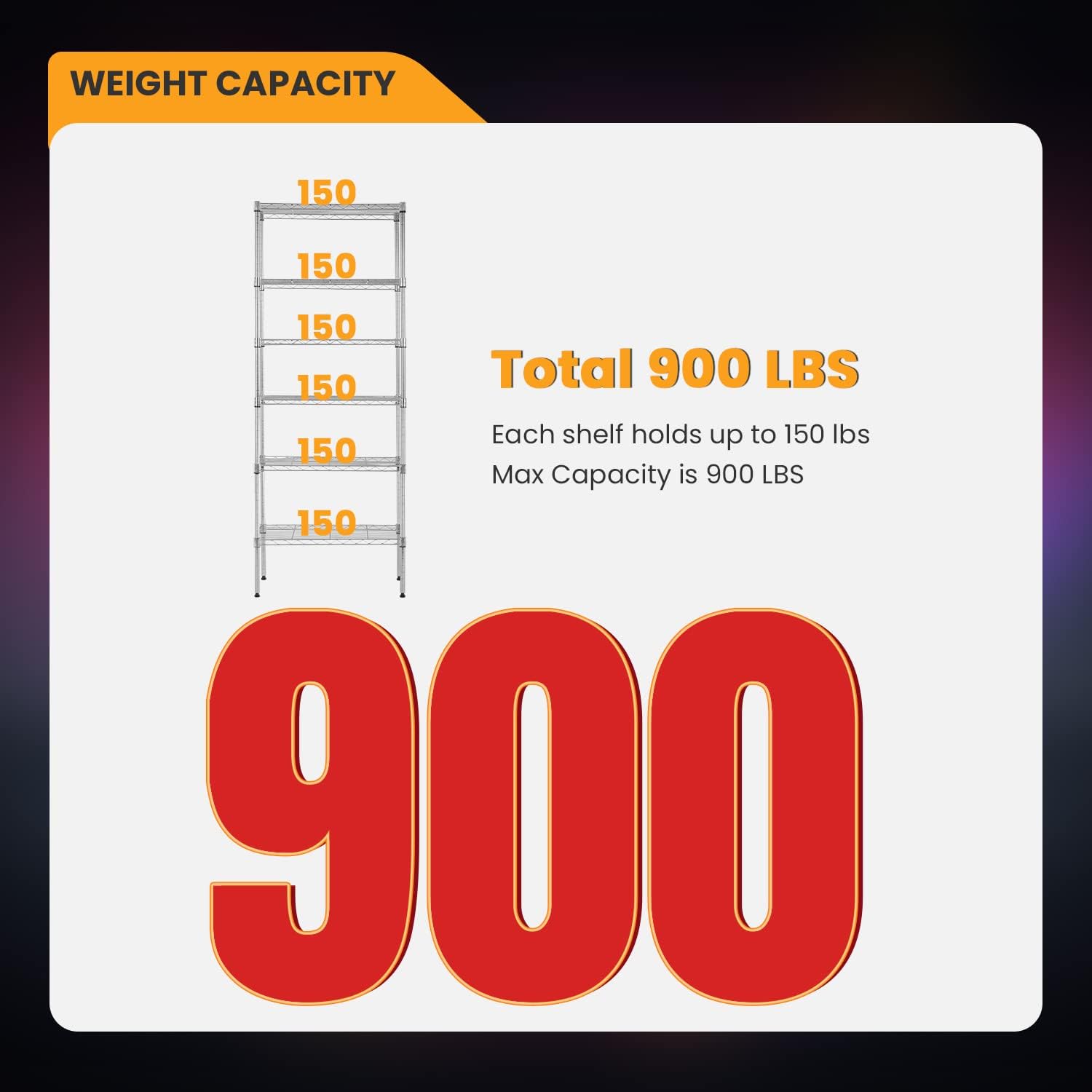 - âăSTRONG WEIGHT CAPACITYă Each shelving can hold 150 pounds (evenly distributed), and the total maximum load weight of the storage shelves for small places is 900 pounds. The shelves for storage for kitchen can put some commonly used living objects on it without worrying about the deformation of the storage shelves.