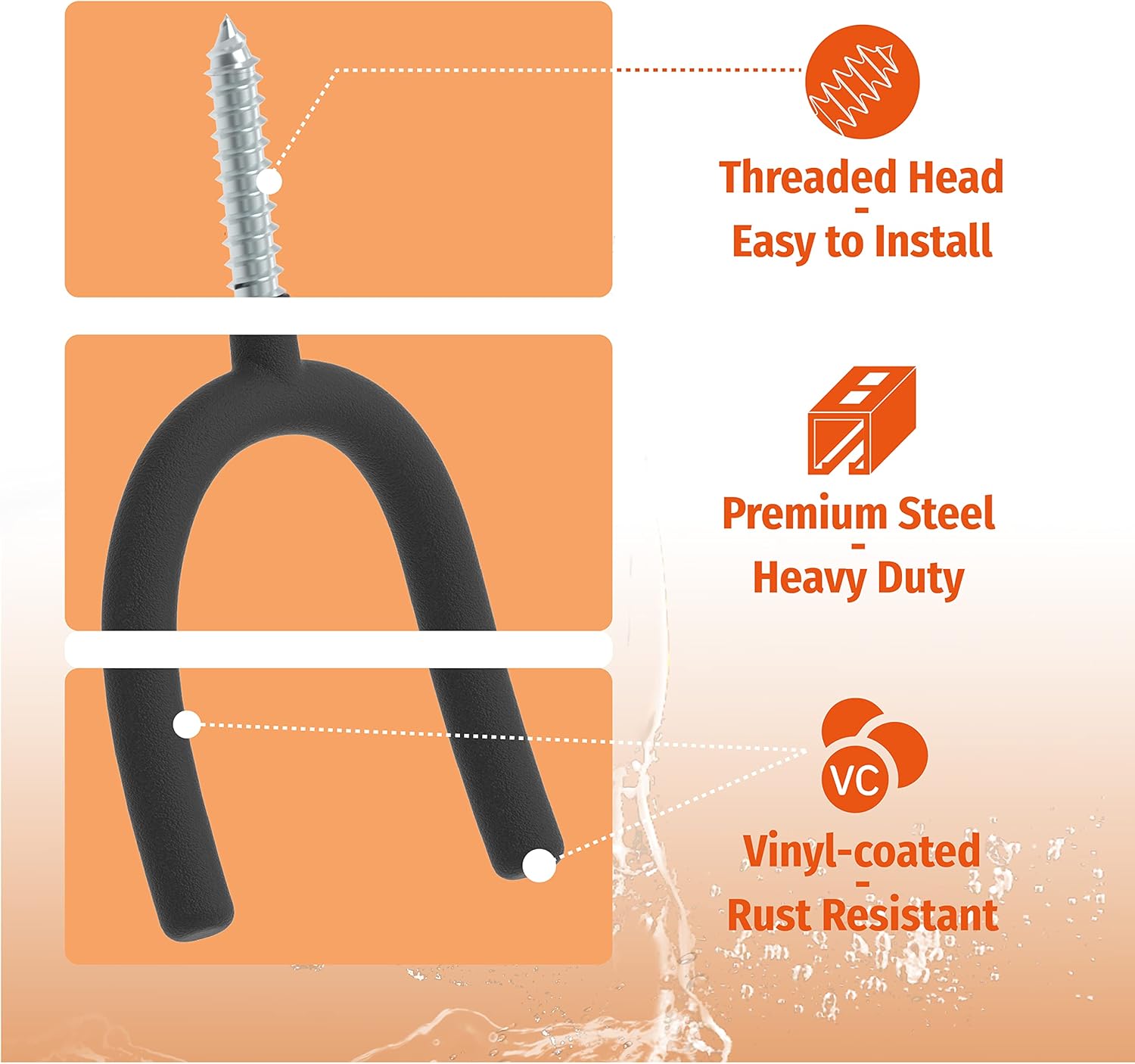 HUHOLE Screw in U Hook, Black Heavy Duty, 6PC, Shovel Holder Wall Mount, U Hooks for Hanging Garden Tools