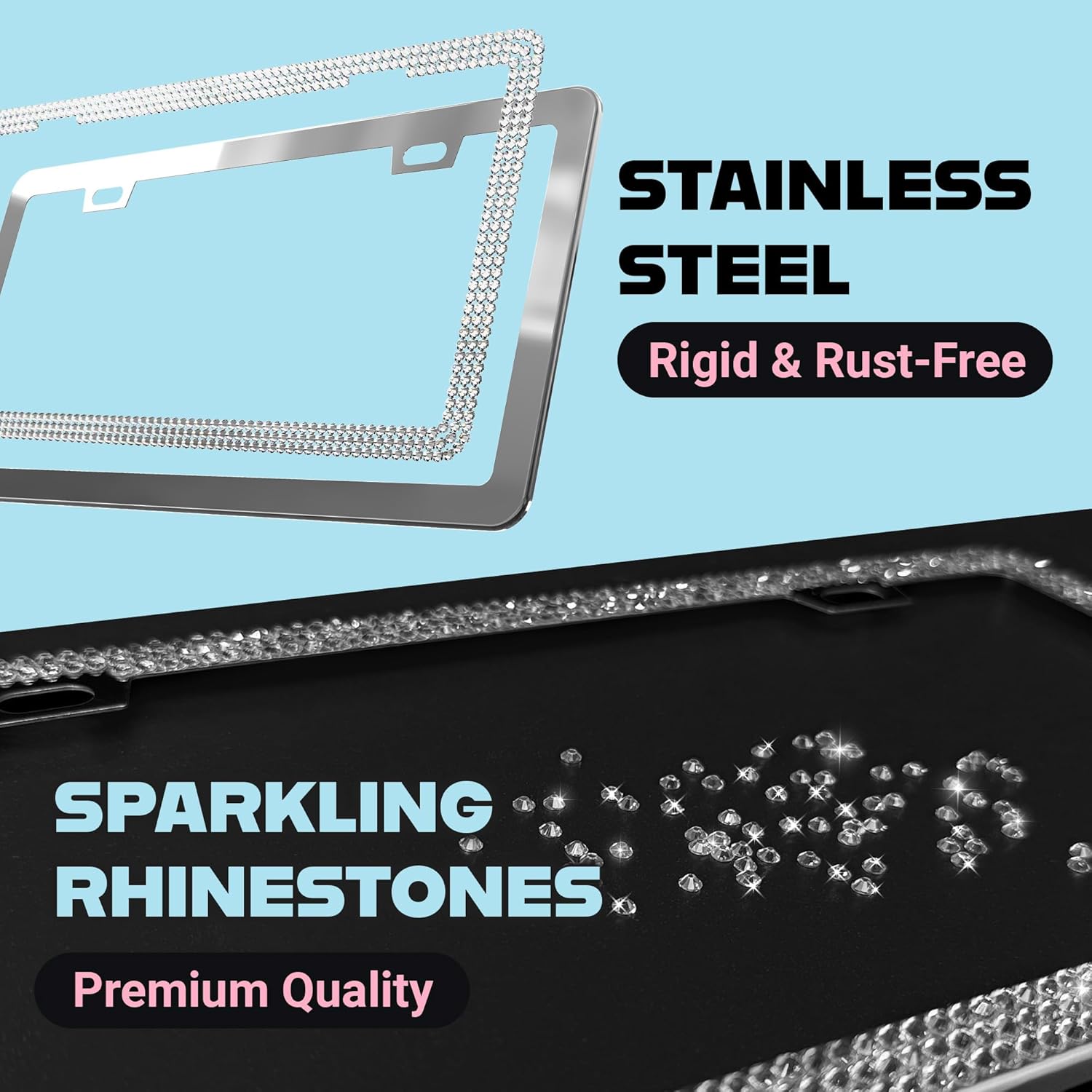 - Glitter Bling Rhinestone License Plate Frame for Women: Add a cute, girly, glittery touch to your ride with this stunning 1-pack licence plate frame that’s made to shine.