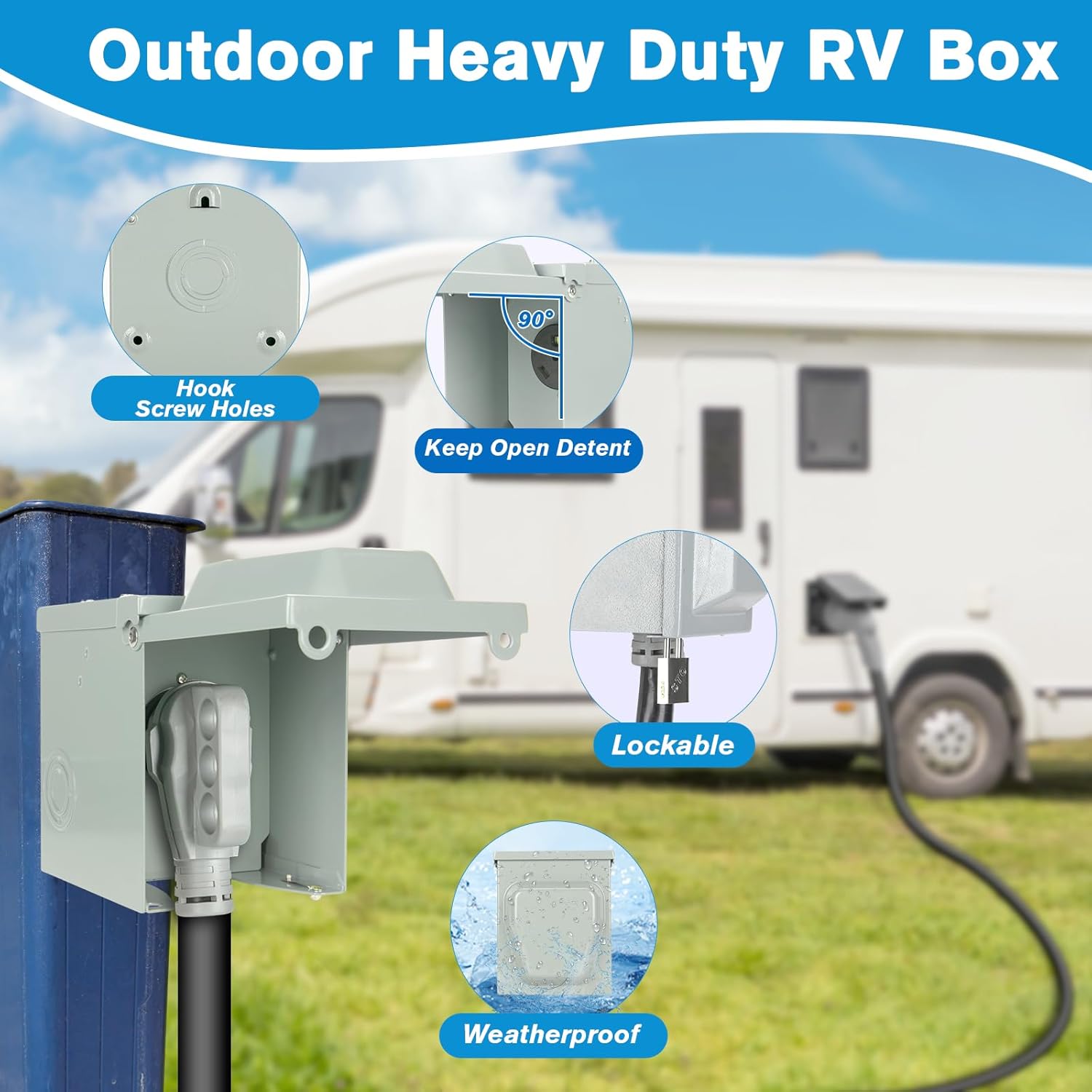 - 【UL Listed】NEMA TT-30R Receptacle 125V with type 3R weatherproof enclosure, which is designed for providing safe and reliable power for your RV, EV car or trailer.