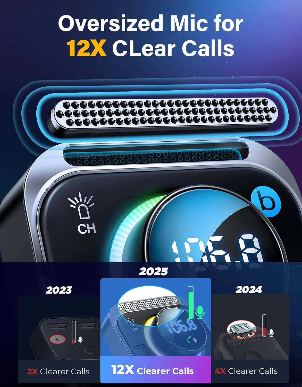 - 📞【Clearer Calls & Siri/Google Assistant】 Enhanced microphone with 2-3 more sound-collecting ports than other car Bluetooth FM transmitter in the market, making sound pickup easier. The latest CVC 8.0 noise reduction technology can filter out background sounds (such as wind from vents and outside) to get clearer calls on both ends. Long pressing the middle button can also wake up Siri/Google Assistant for GPS audio, stream your music, etc.