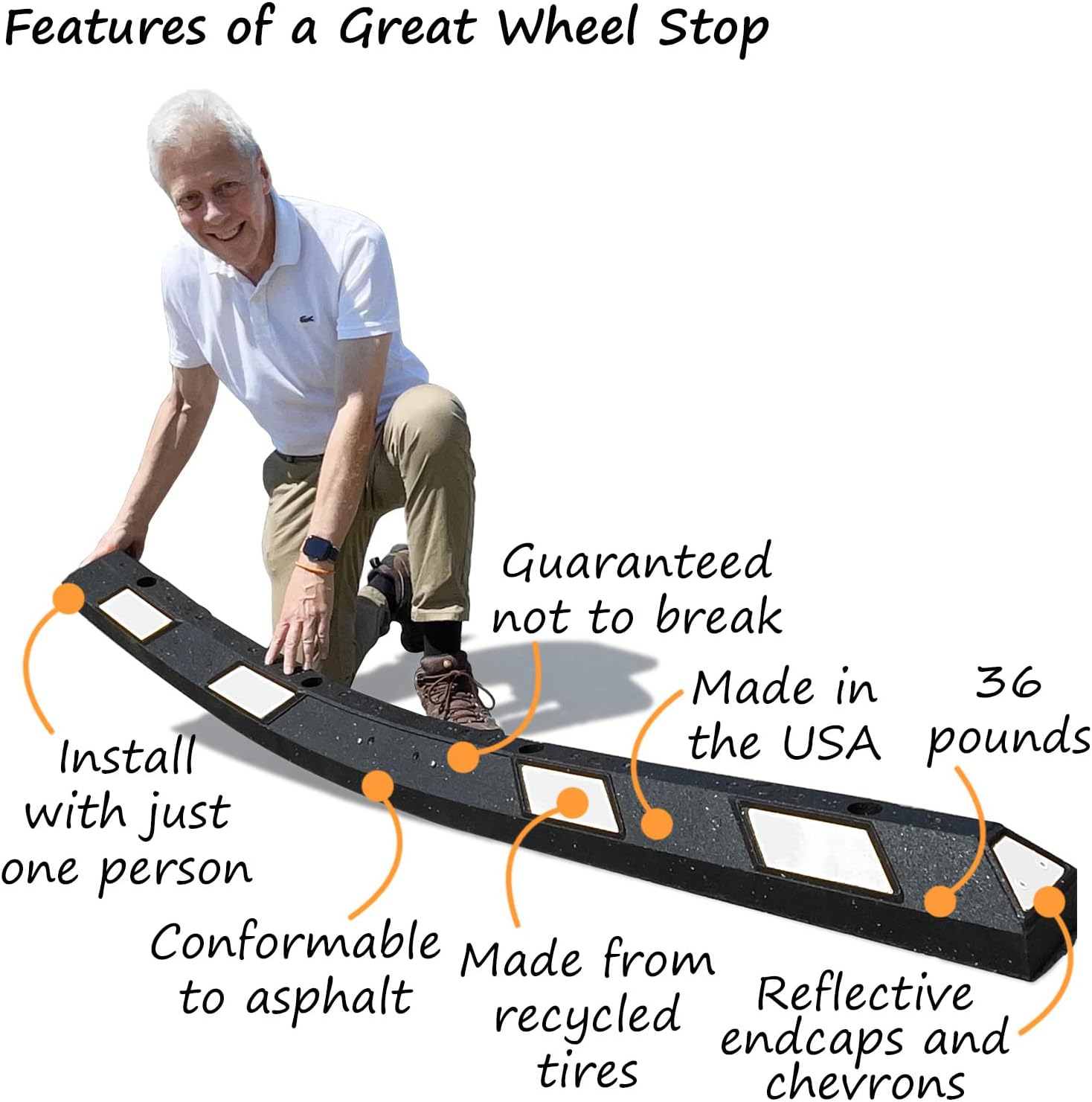 - DURABLE. Resistant to extreme temperature variations, UV light, oils, moisture, road salt and damage. Rubber Wheel Stops will not rust, chip, crack, crumble, corrode or need repainting.