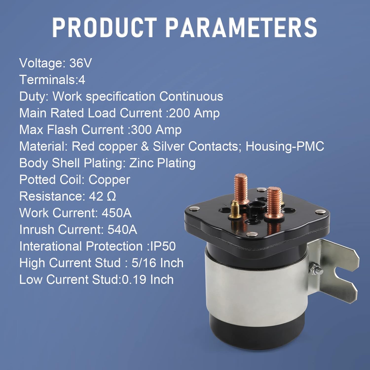 - ✦ 【Spec】Voltage: 36V Terminals:4 Duty: Continuous Main Rated Load Current :200 Amp Max Flash Current :300 Amp Body Shell Plating: Zinc Plating Potted Coil: Copper Work Current: 450A Inrush Current: 540A High Current Stud : 5/16 Inch Low Current Stud:0.19 Inch
