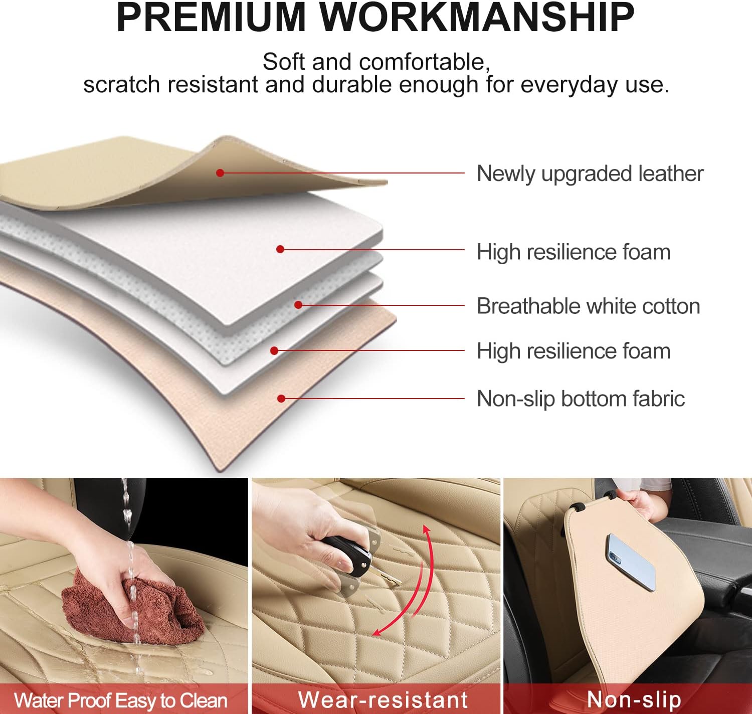- Leather Soft & Comfortable: The PU leather front seat covers are wear-resistant, scratch-resistant, waterproof, and easy to clean. Rebound composite material is soft in touch, creating top resilience for maximum comfort during your drive. The non-slip backing ensures that the front seat covers stay in place. It's easy to care for and clean with a wet soft towel.