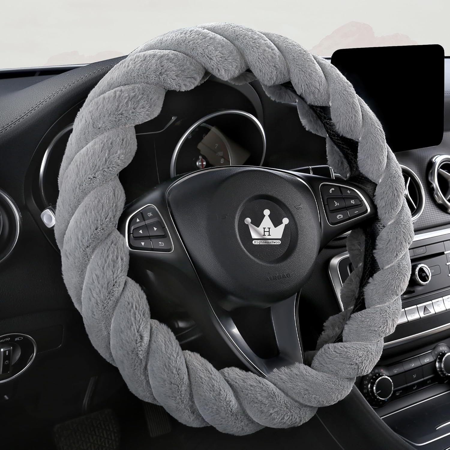 Luxury Fluffy Winter Car Steering Wheel Cover for Women Soft Warm Plush Cute Auto Accessories for Vehicle, Sedan, Universal, Fuzzy, Anti Slip, Gray, Standard Size, 14.75-15.15"