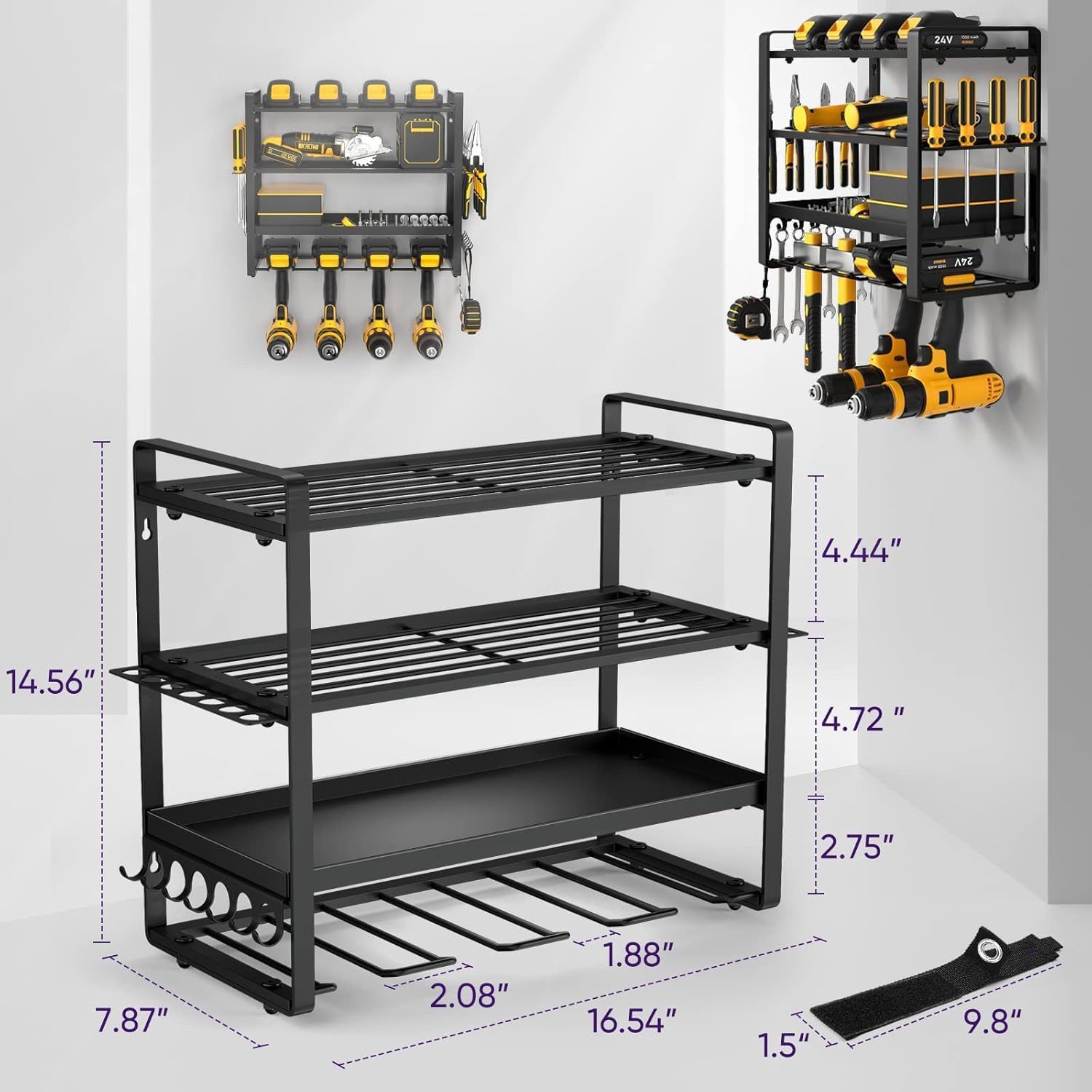 - THICKENED AND REINFORCED DESIGN: The heavy duty designed power tool rack will help you load tools up to 200lbs with all 4 wall mount anchors.