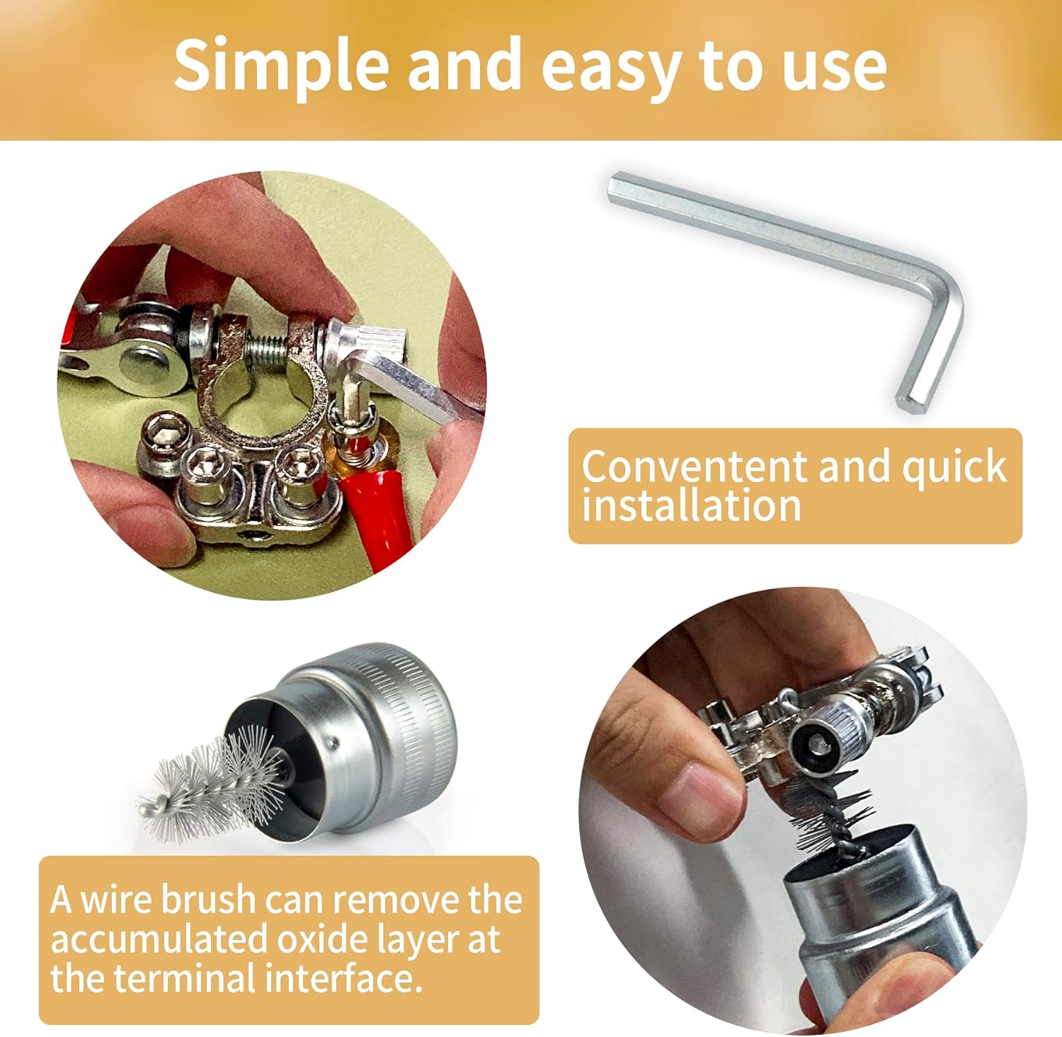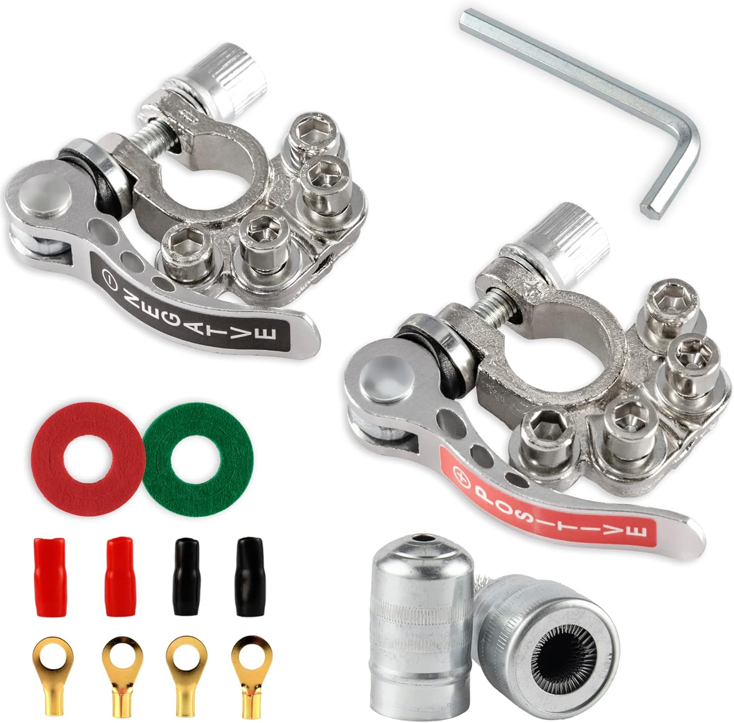 - You Well Get: Package contains 2 battery terminal connectors (positive and negative), 4 insulation sleeves, 4 Terminal block , 1 Battery Terminal Cleaners, 2 battery anti-corrosion washers and a hex wrench.