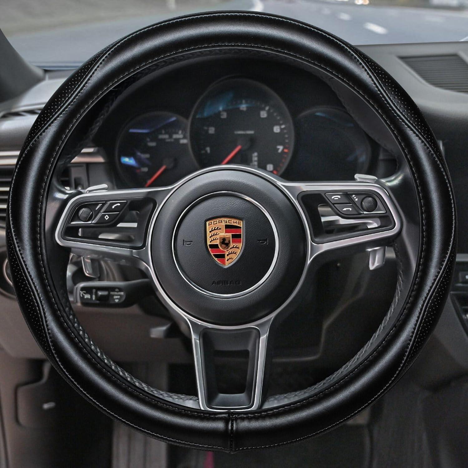 - SOFT & COMFORTABLE TOUCH: Using a real leather streeing wheel cover to help absorb hand pressure from the steering wheel. It’s soft and durable with a breathable touch.