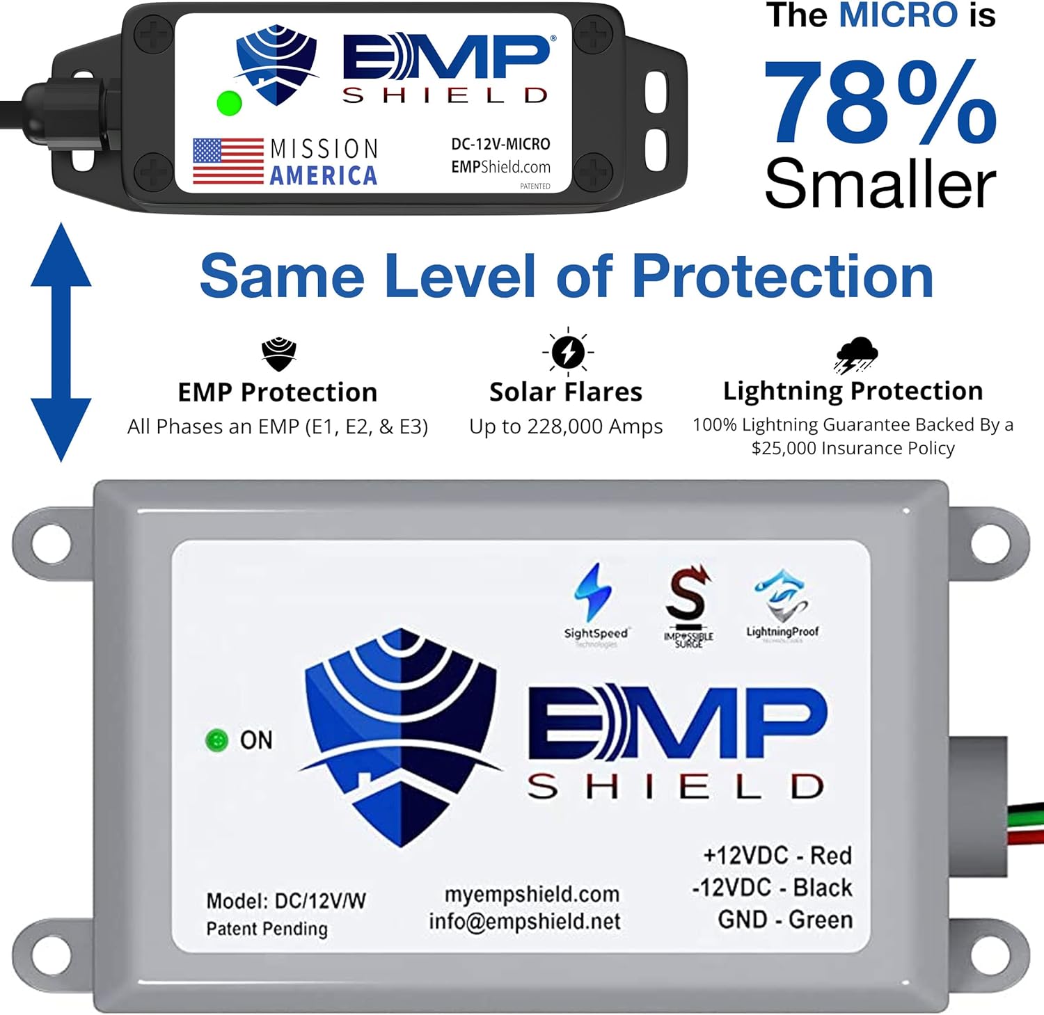 - NEW! Our EMP Shield model is 78% smaller than previous models with the same EMP, CME and lightning protection as our original. Perfect for UTV, ATV, Motorcycle, and any vehicle that has limited space.