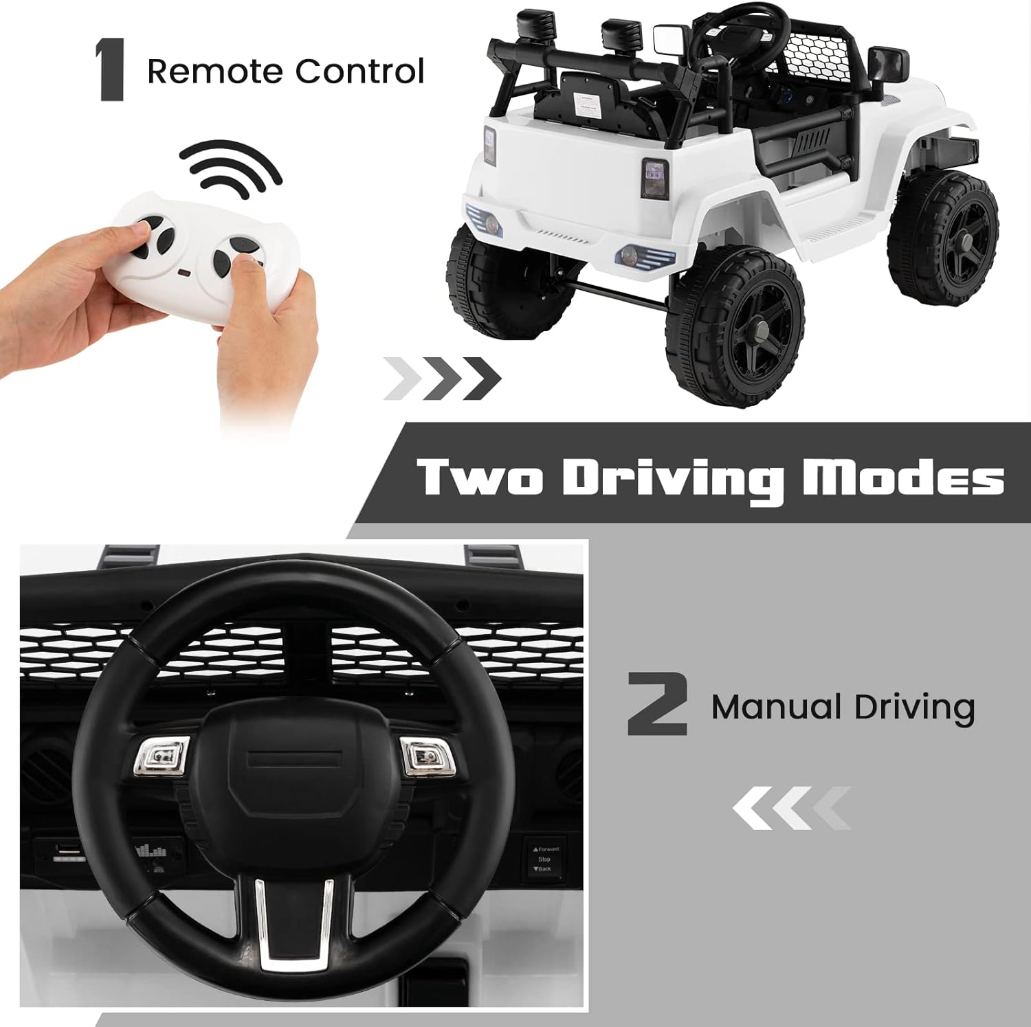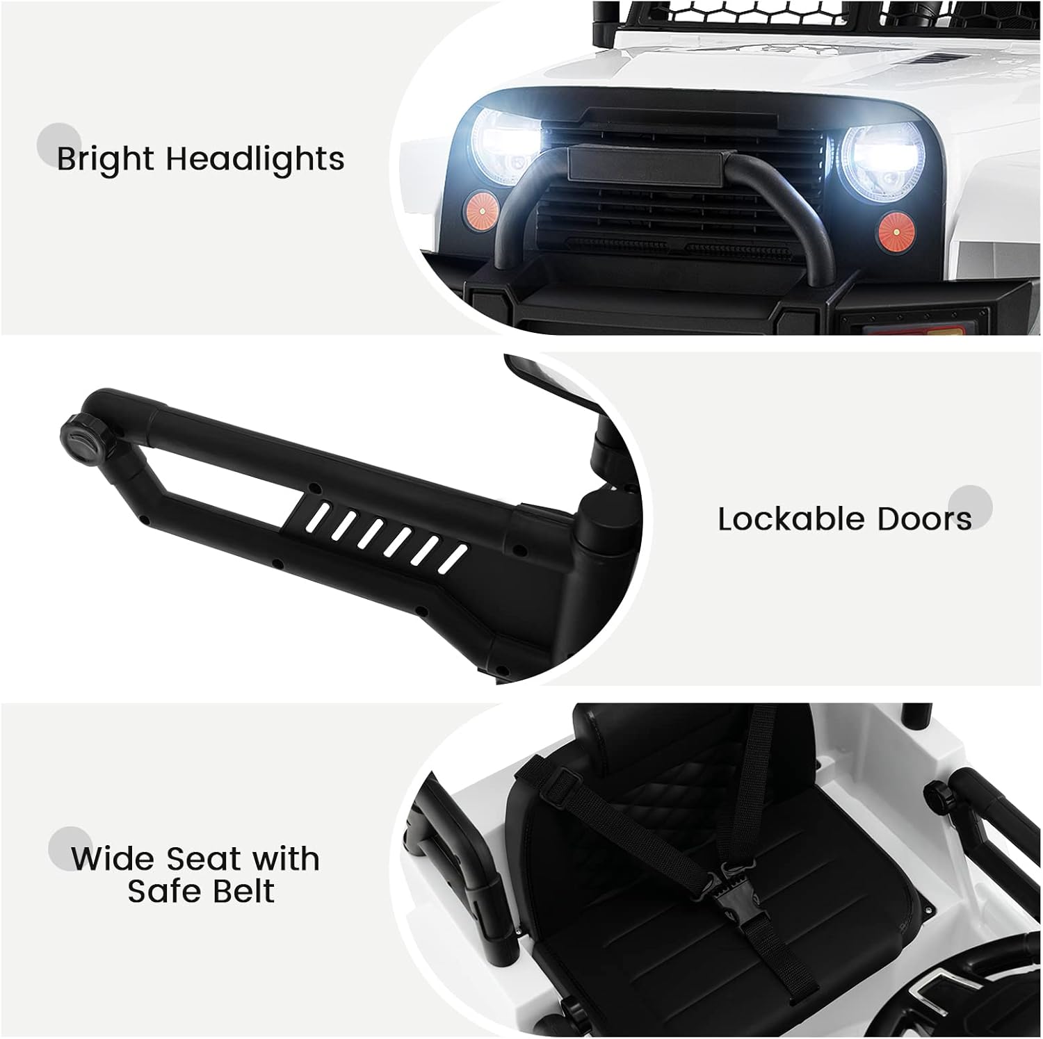 OLAKIDS Kids Ride On Truck, 12V Electric Vehicle Jeep Car with Remote Control, Toddlers Battery Powered Toy with 2 Speeds, Spring Suspension, Double Open Doors, LED Lights, Music, TF, USB, Mp3 (White)