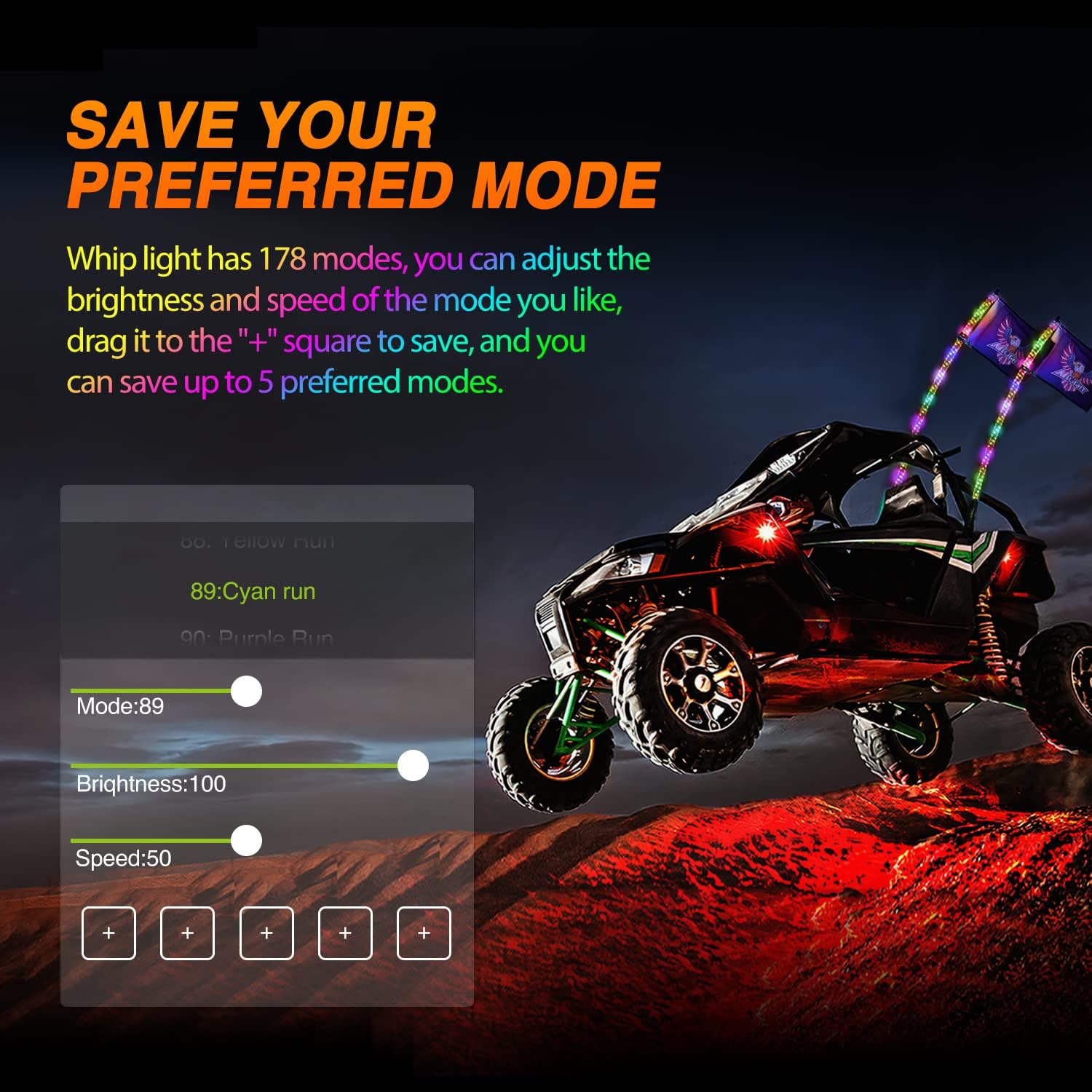 - ăAPP & Remote ControlăDual control by Bluetooth APP and RF remote with a hook, no more worries about losing the remote. And you own more superpowers to control this magical whips, including grouping with friends' devices, countless RGB colors & editable chasing modes options, amazing syn-with music modes and being able to adjust color brightness/speed/colors.