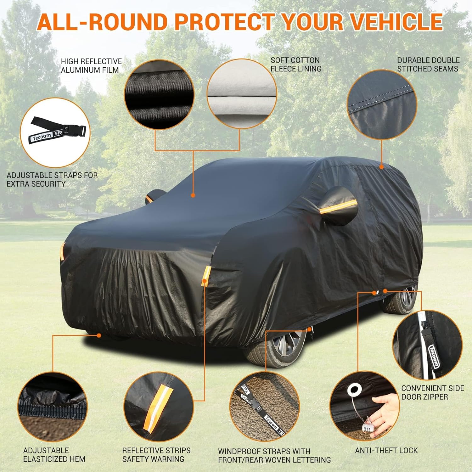 Tecoom Car Cover Waterproof All Weather, Thick Fleece Lining Car Covers for Automobiles with Lock/Zipper Door, Outdoor UV Sun Snow Windproof Hail Protector Car Cover SUV (170-190 Inch)