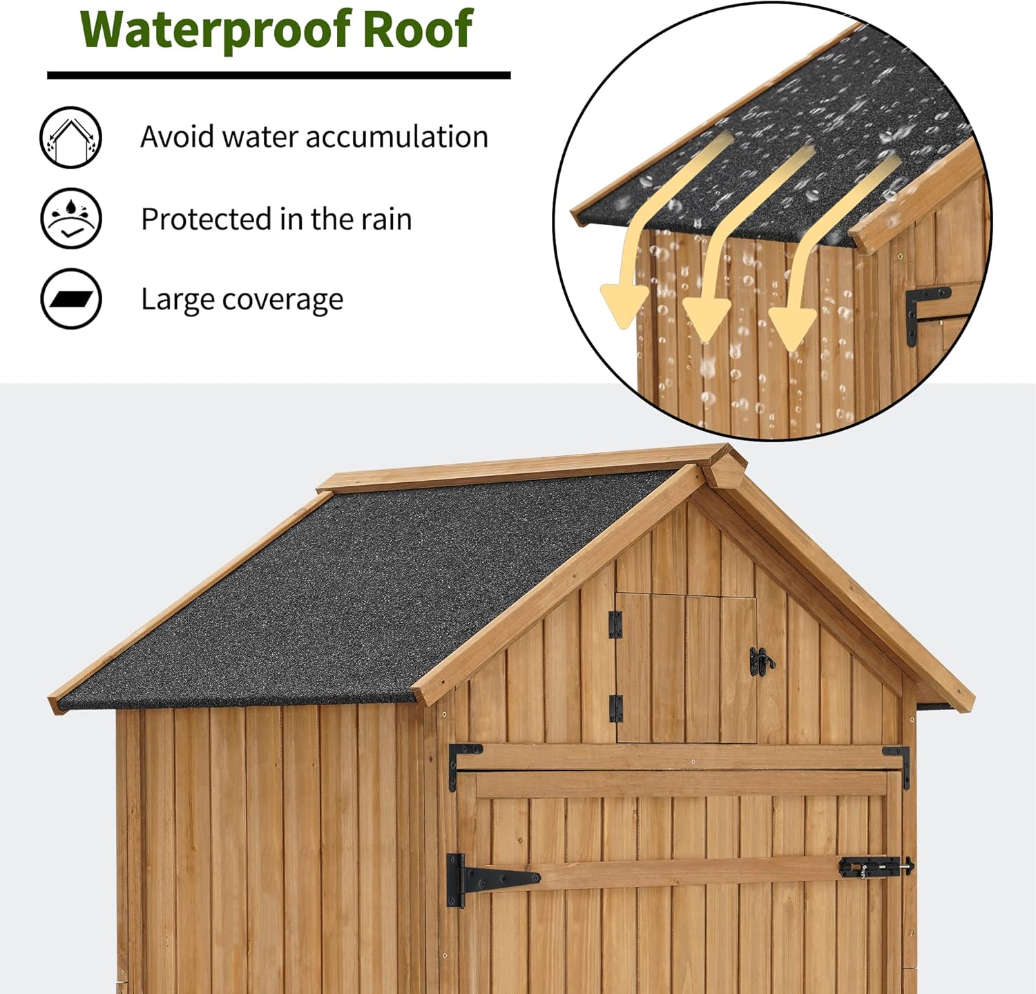 - Fir Wood Construction: Crafted from fir wood with a polished exterior, this storage shed showcases a natural, rustic style that blends seamlessly with any outdoor décor; The medium brown finish enhances its aesthetic appeal while ensuring long-lasting durability