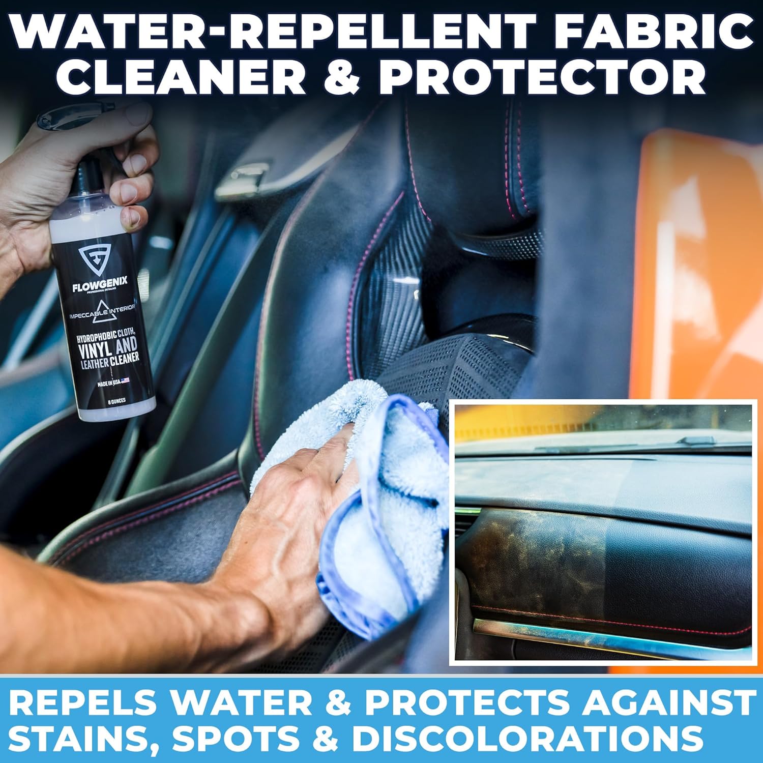 - ✅ WATER-REPELLENT VINYL & LEATHER CLEANER - IMPECCABLE INTERIOR: This water-repellent treatment adds a protective coating that will repel water, stains, and scratches. Designed for canvas, leather, suede, awnings, carpets, upholstery, nylon, and other similar textile. Impeccable Interior is transparent and breathable, preventing any color change on the material it’s applied upon (8oz bottle)