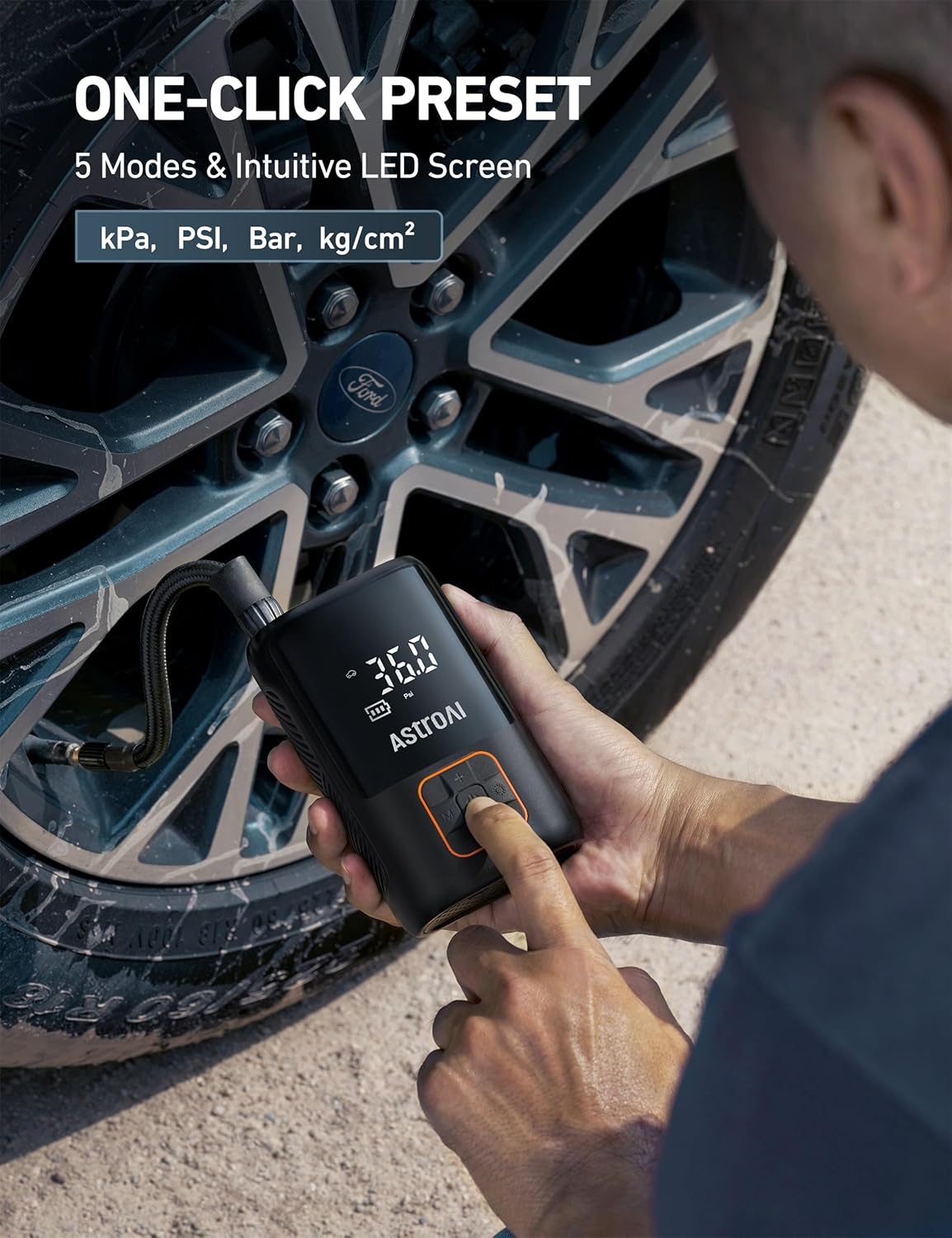 - Realtime Large LCD & Smart Preset: The air compressor is equipped with a large LCD screen that simultaneously displays the current and preset pressure. Monitor tire pressure in real time with intuitive readouts and easy inflation. Includes four smart preset inflation modes: bicycle, motorcycle, car, ball, and custom mode; easy operation. Automatically shuts off when it reaches the preset value. No worrying about over inflation, smart and efficient. Four units to choose, PSIăKPAăBARăKG/CM².