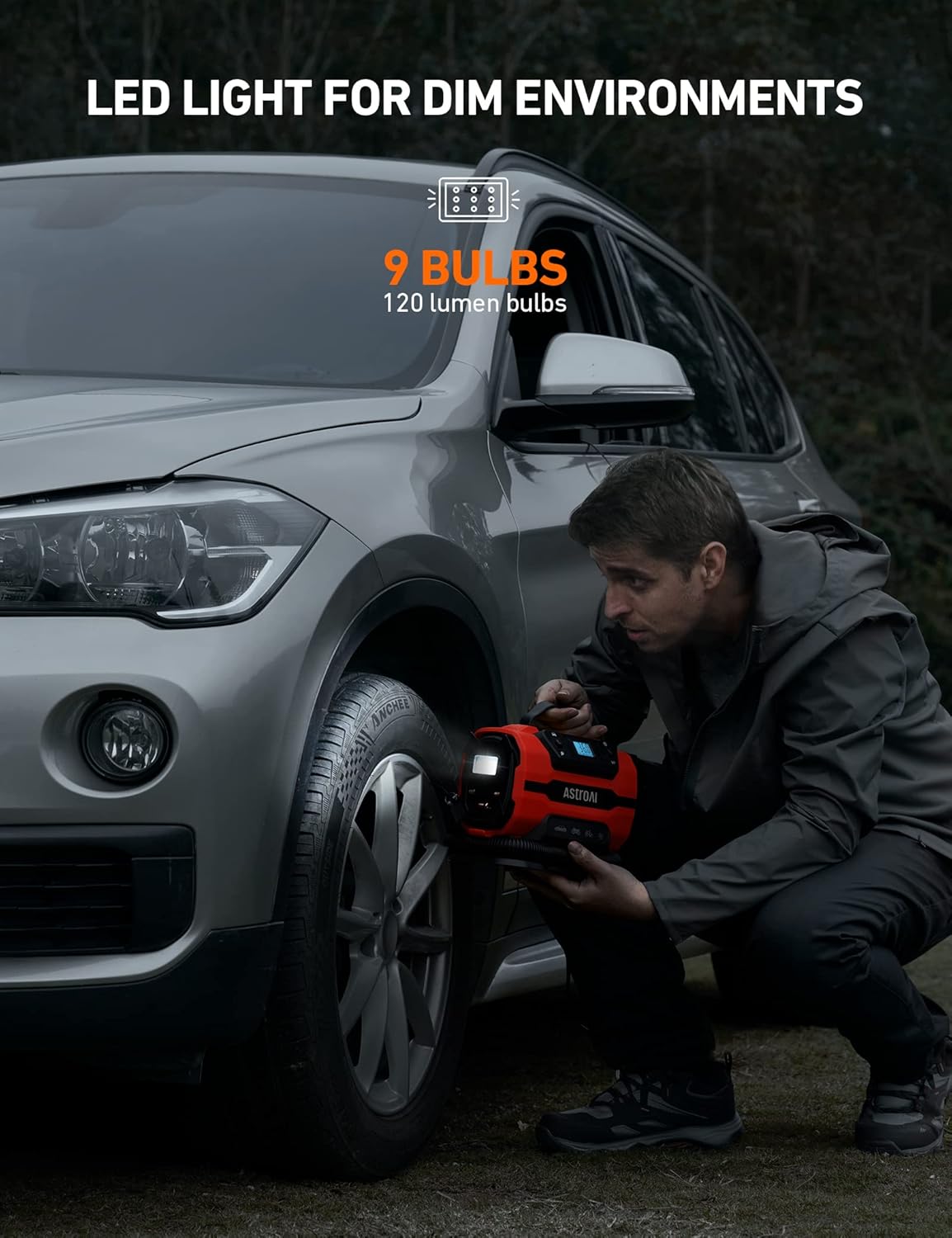 - 12 V DC/120 V AC Dual Power: The AstroAI Tire Inflator features dual power supplies, compatible with 12 V car cigarette lighters and 120 V household outlets, convenient for both home and travel use.