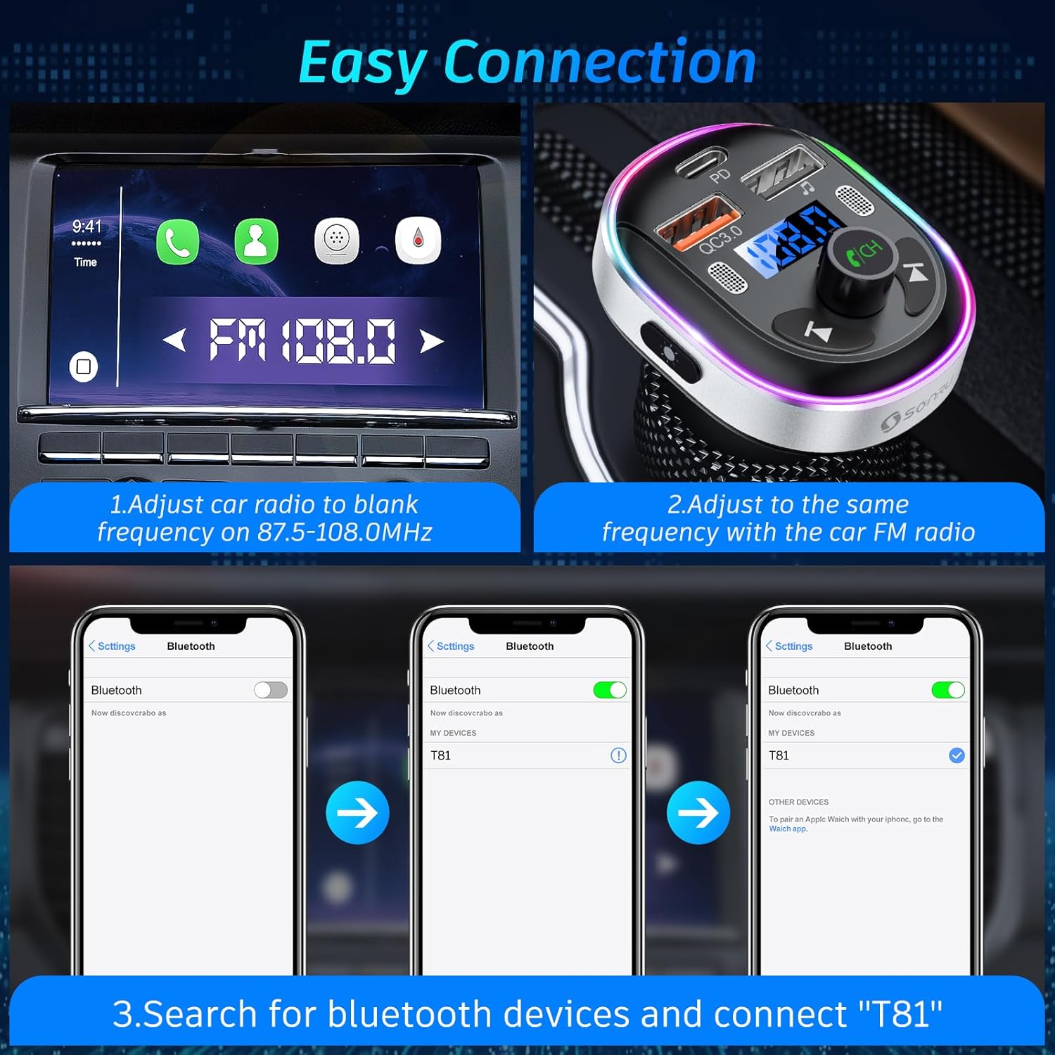 - [Most Advanced Bluetooth 5.3] SONRU bluetooth 5.3 fm transmitter offer you a faster, more stable and smarter connection with CD-like sound quality, optimizing the transmission delay and connection defects of old Bluetooth version. This bluetooth adapter for car is well compatible with various fast charging devices.