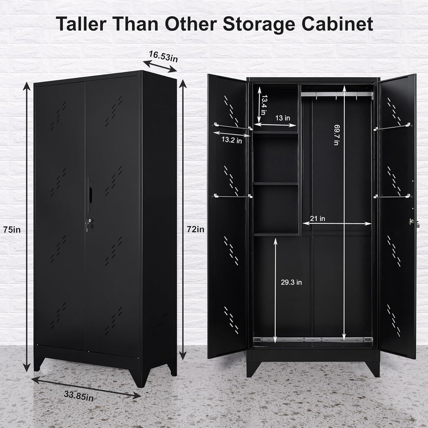- Multi-scene Multi-purpose:Why choose our storage cabinet? ๐ข๐ก๐:75" tall , taller than other metal cabinet. ๐ง๐ช๐ข: Higher vertical space to store large items, such as mops, brooms, fishing rods, buckets, shovels, etc. ๐ง๐๐ฅ๐๐: There are 10 ventilation holes on the cabinet to keep the inside dry. ๐๐ข๐จ๐ฅ: Stainless steel leaky holes at the bottom, anti-rust. ๐๐๐ฉ๐:Locker with 2 keys.You can use it in the office storage room, garage, home, warehouse,laundry room storage,storeroom.