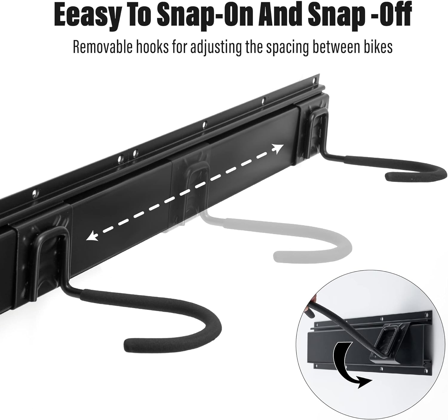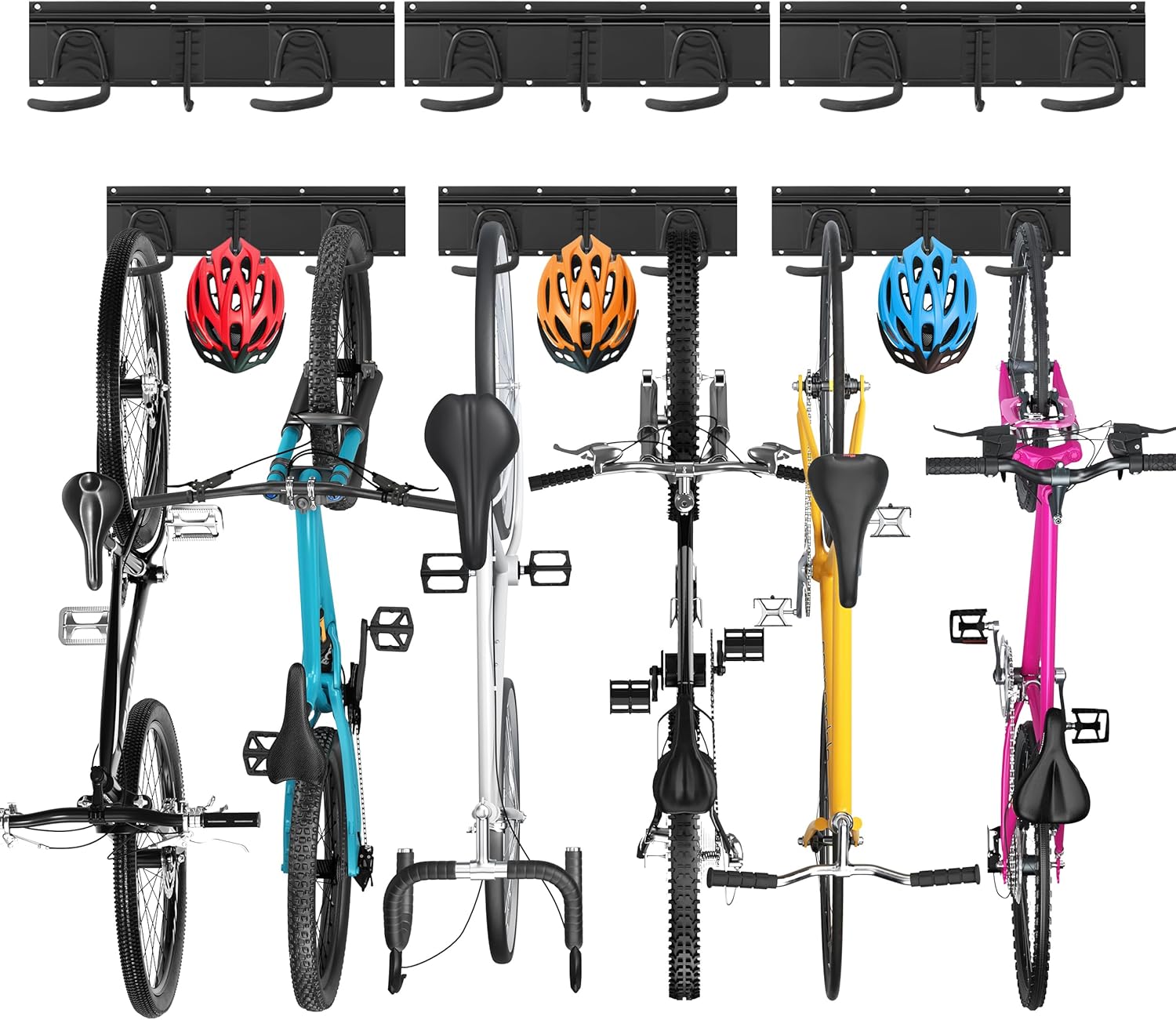 - Package includes: 6 bike hooks + 3 helmet hooks + 3 hook guide rails, bike hook specification 75*160*110mm, helmet specification 100*38*2mm, plate specification 405*100*2mm, suitable for 6 bike parks.