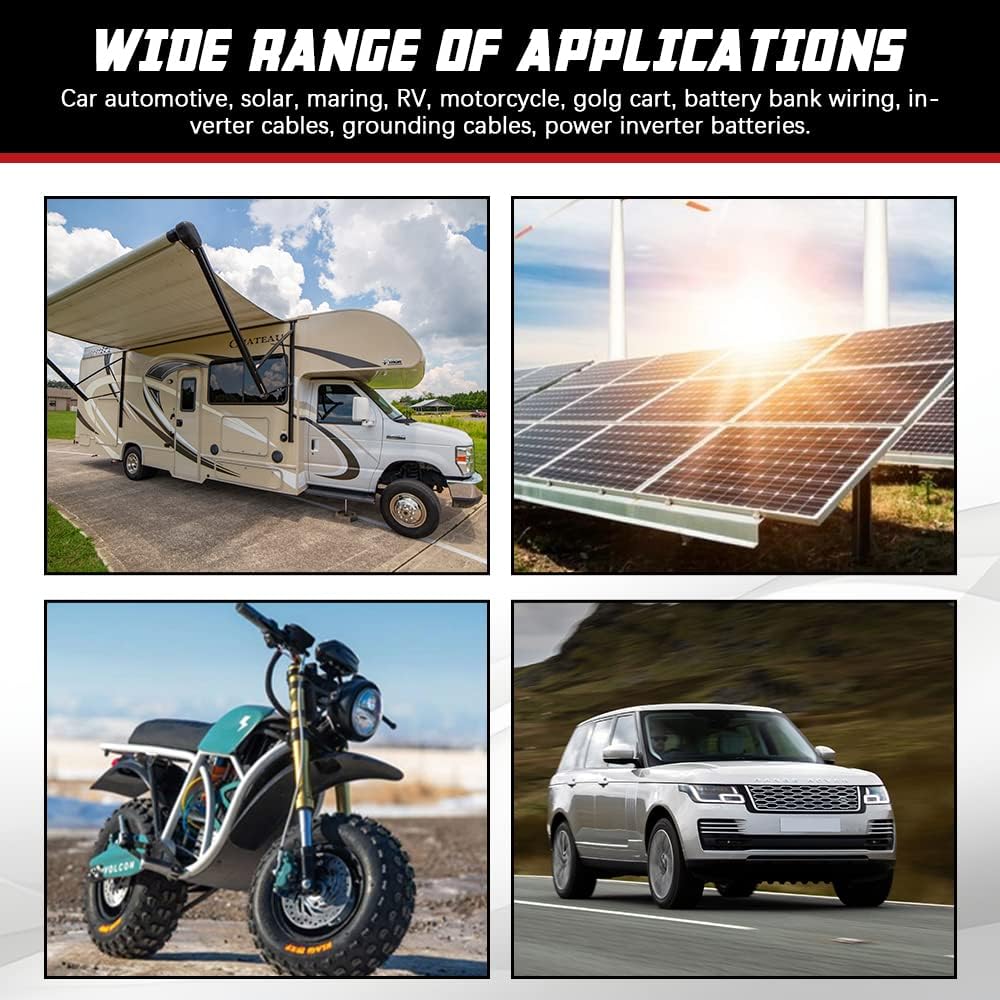 - 【Wide Application】Our battery parallel cables are widely used for car automotive, solar, marine, RV, motorcycle, golf cart, lawn/garden equipment or power inverter batteries, also used for electrical equipment.
