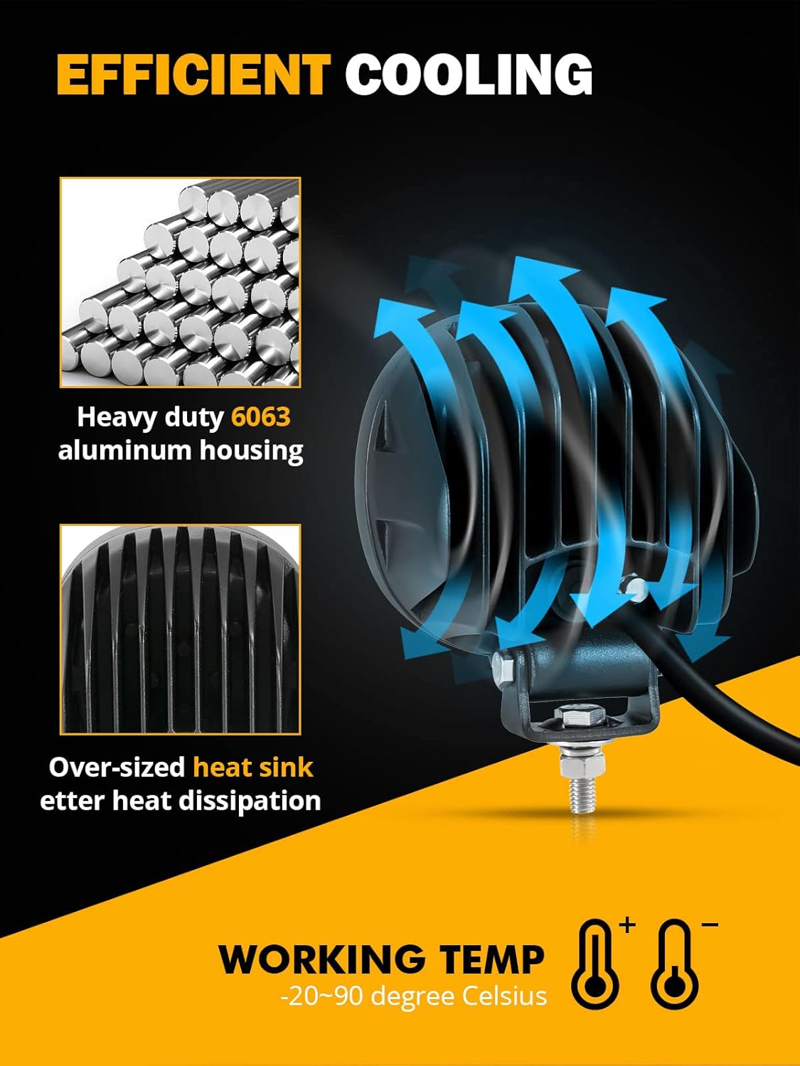 - ăLAST OVER 50,000 HOURSăMade of thickened 6063 diecast aluminum heat sinks, over sized heat-sink and breathing vent make lights fast running cooler. Even in harsh driving condition, it can still maintain an impressive 50,000 hour average life span.