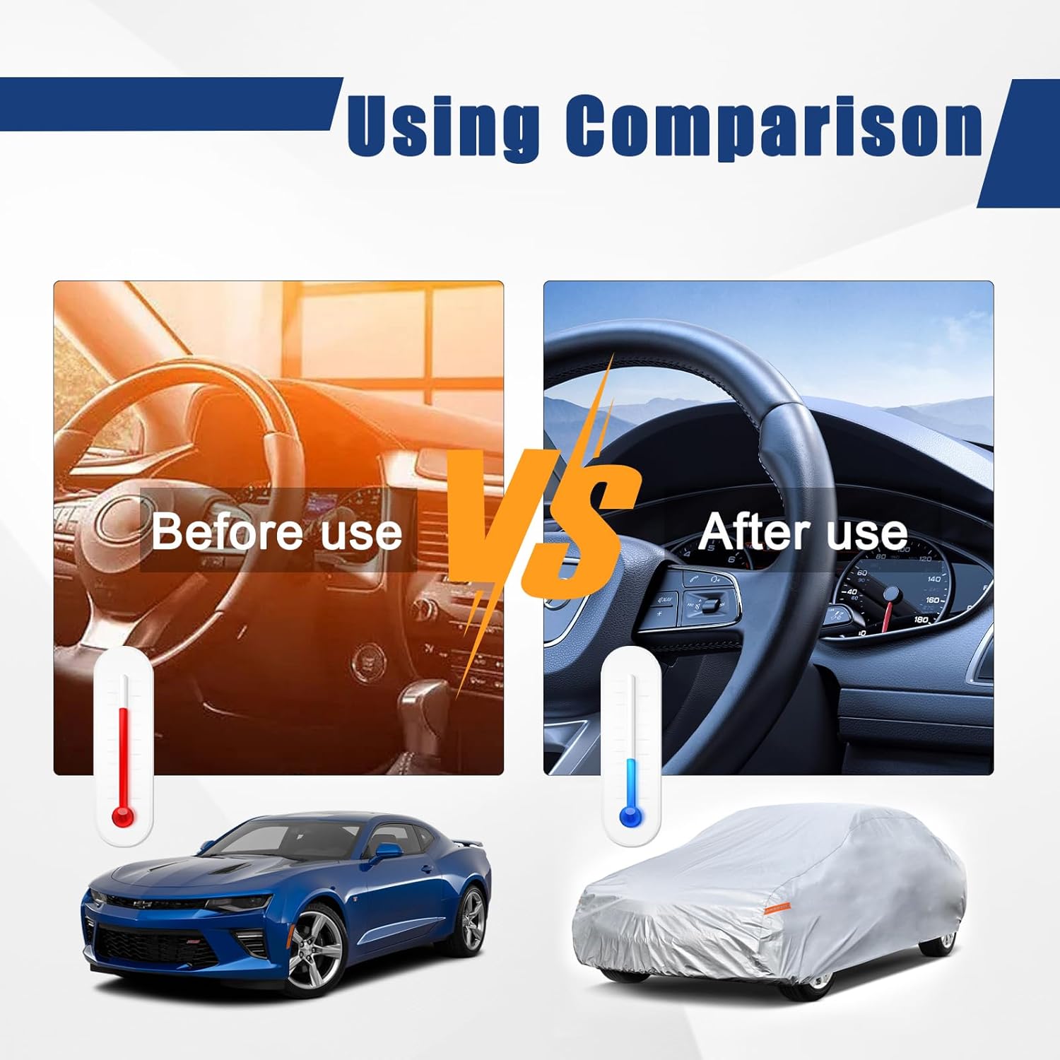 - ăPremium Materială-Kayme 6 layers car cover is made of heavy duty material. 1 PE&PEVA is 100% waterproof, It's great for rainproof snowproofing. 2 High reflective aluminum is good at sunproof and anti-uv, Keep the car cool in the summer. 3 Thicker and soft cotton will protect vehicle painting. Kayme multi-layer material is much thicker and more durable than other similar products.