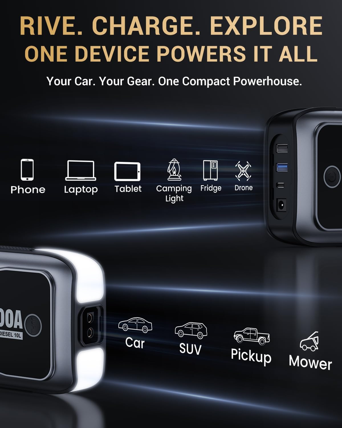 - đă Light You Can Rely On ăEquipped with a 400-lumen LED flashlight and three emergency modesâsteady, strobe, and SOSâthis compact jump starter ensures visibility in roadside emergencies and outdoor conditions. One-button control makes it easy to operate, while the LCD screen keeps power status clear. A true emergency jump starter with light you can count on